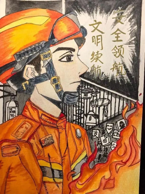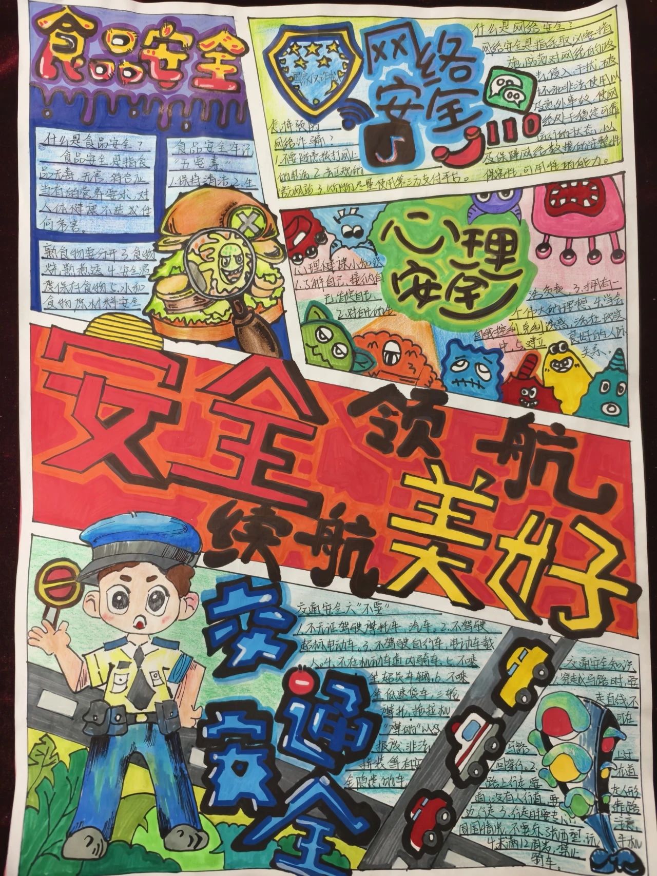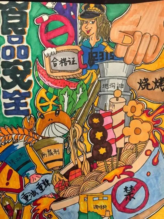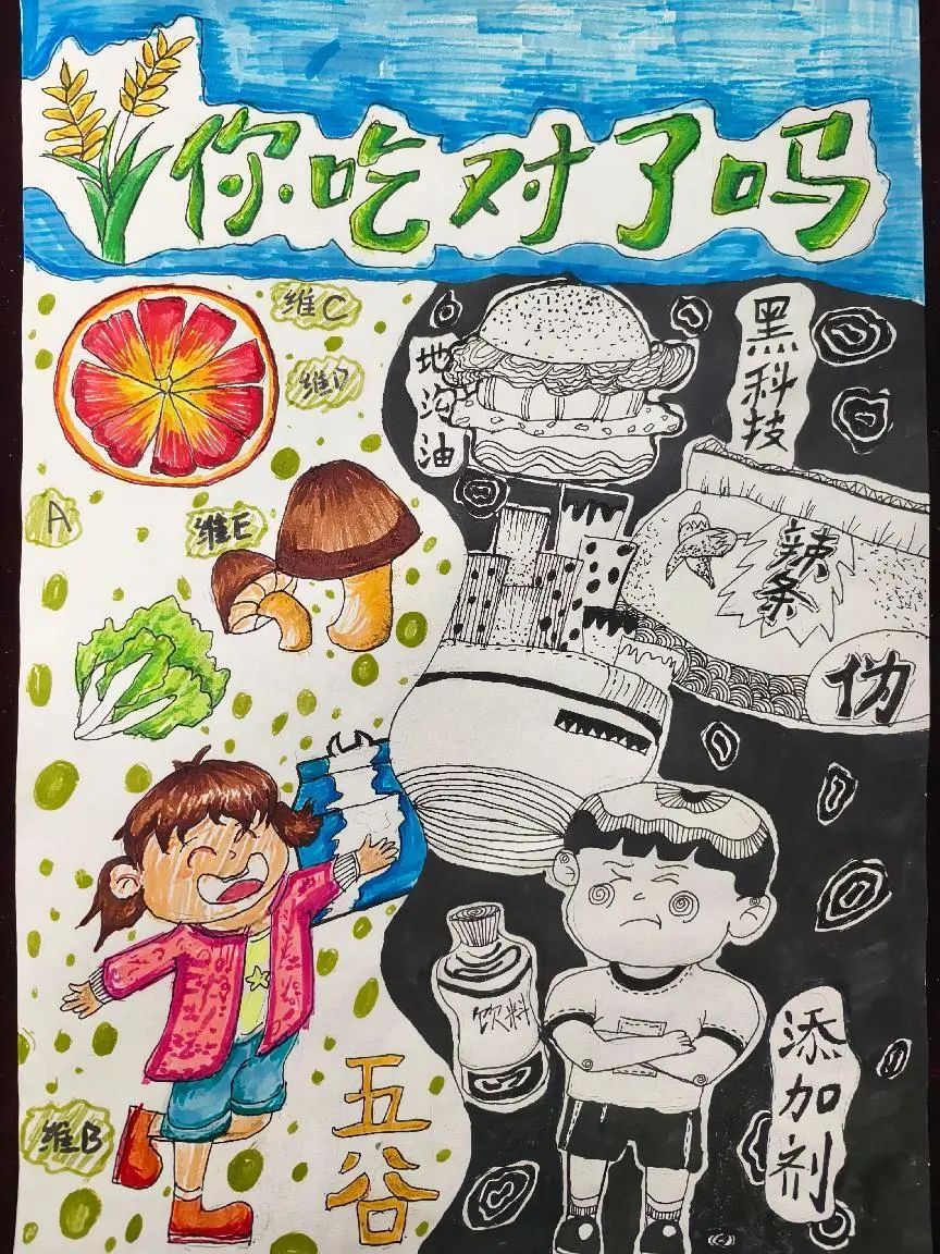 本次比赛分为平面设计和短视频两个赛道进行。在赛道一中,学生们积极参与到平面设计中来,提交了许多优秀的作品。参赛者们以手抄报、国画、水彩、素描海报等形式阐述并广泛传播安全文明知识。参赛者们围绕消防安全、食品安全、网络安全等方面展开创作,不仅色彩搭配大胆又和谐,设计思路也别出心裁,并且传递出深刻的安全知识理念。其中,孔晓彤同学的作品以彩色与黑白区域做对比,既突出了健康食物的诱人,又展现出不健康食品的问题 。内容选题很新颖,关注饮食健康,区分有益和有害食物。绘画生动,人物表情丰富,食物细节到位,能直观地传达食品安全的知识理念,夺得赛道一桂冠。