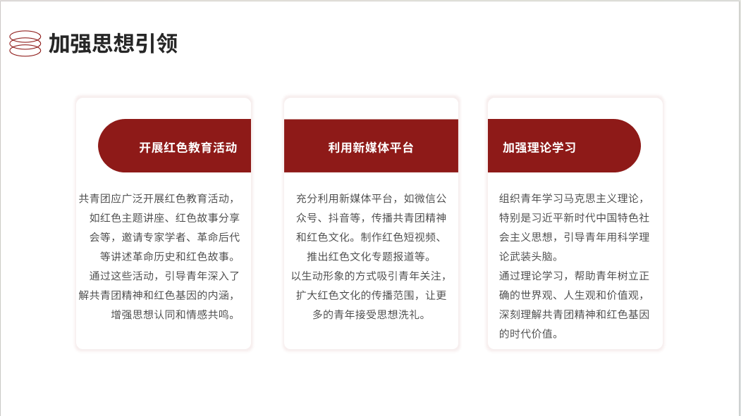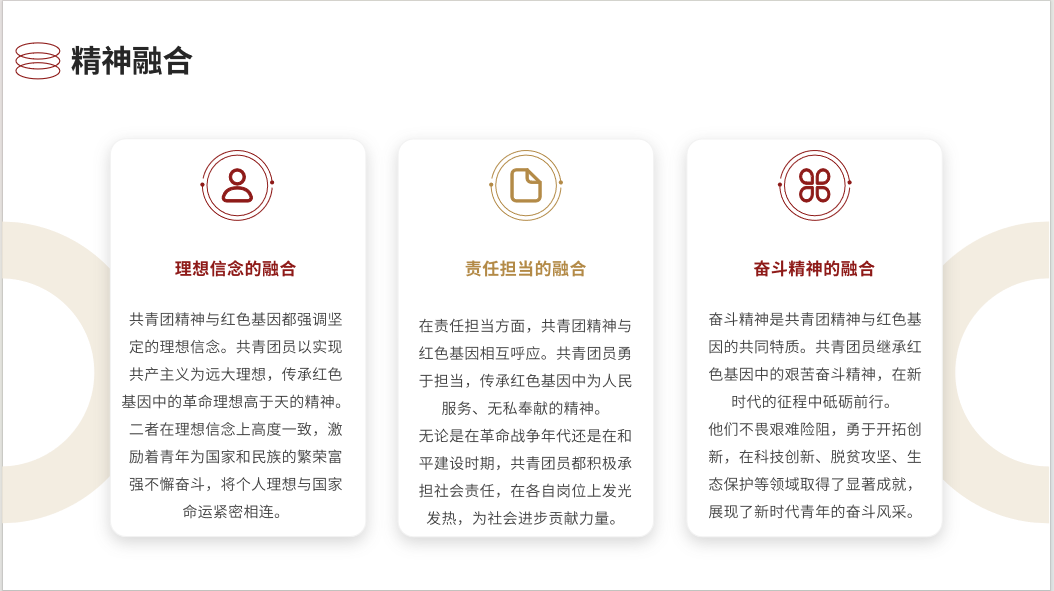 本次团课分为四部分,分别为共青团精神的内涵与价值,红色基因的内涵与价值,共青团精神与红色基因的融合,以及弘扬共青团精神,传承红色基因的路径。