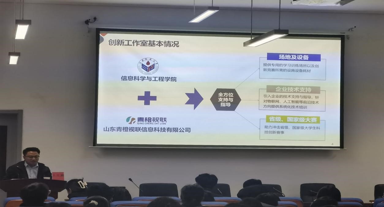 2023年3月18日,第三届青橙杯智能物联科技创新竞赛暨中国大学生计算机设计大赛宣讲会如期顺利召开。本次活动由信息科学与工程学院党总支副书记孙向群指导,创新创业与就业工作指导教师夏天宇组织,邀请山东青橙视联信息科技有限公司王志鹏工程师作为宣讲会主讲嘉宾莅临指导,同时,往届参赛获奖选手与同学们分享了比赛经验。活动旨在让同学们对第三届青橙杯智能物联科技创新竞赛暨中国大学生计算机设计大赛有更加深入的理解,并在此基础上丰富同学们的大学生活,为他们提供一个展示自我创意和个性的舞台。