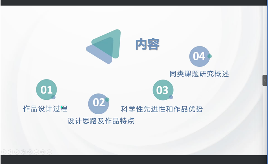 会议上,首先由项目团队从产品背景调研、设计理念、研究步骤、技术路线、发展规划以及未来展望等方面,通过PPT讲解,视频演示等方法向模拟答辩的指导老师介绍所属团队的作品。随后,再由山东青橙视联信息科技有限公司工程师王志鹏老师和夏天宇老师根据参赛队伍对于项目的介绍提出相应的问题,并为相关项目提供了小到PPT的制作方法、大到项目的完善和呈现上的宝贵意见和建议,为同学们进一步完善自己团队的项目作品指明了方向。