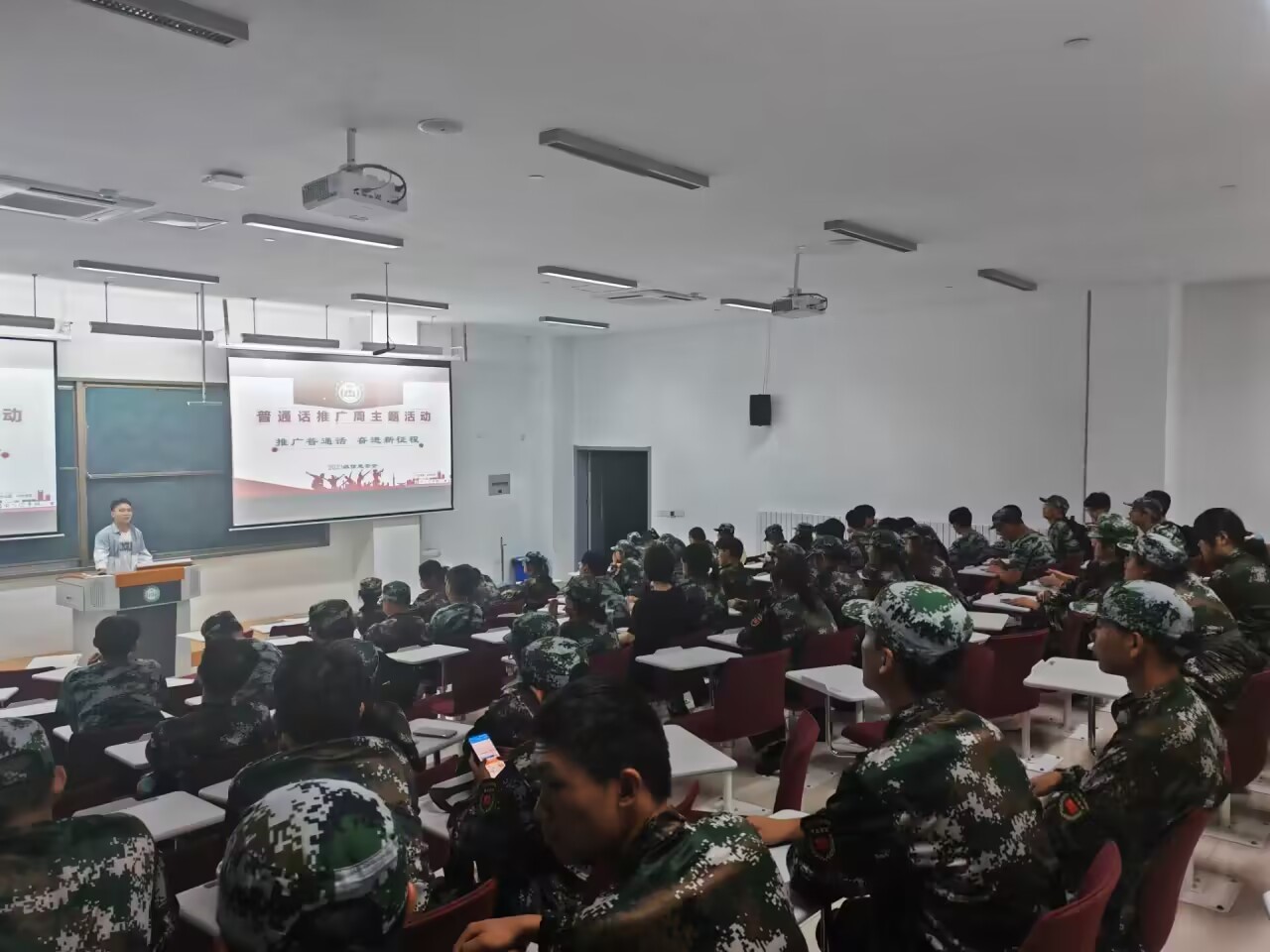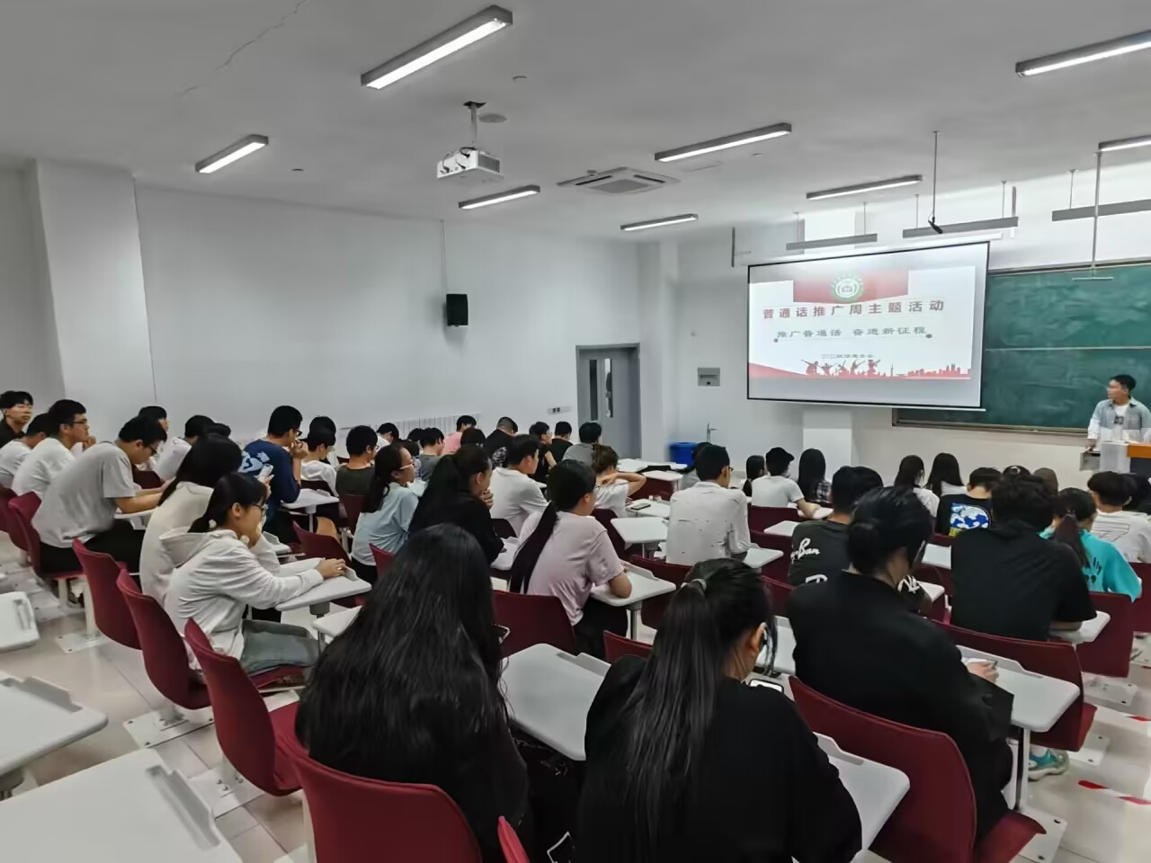 学院围绕“推广普通话,奋进新征程”这一主题进行普通话推广周活动宣传,并且与“新生推普训练营”“建设文明校园”“推普助力乡村振兴”“推普进课堂”等多种元素有机结合,同时要求各带班多次组织,采取线上线下、开展讲座等多种形式进行宣传。