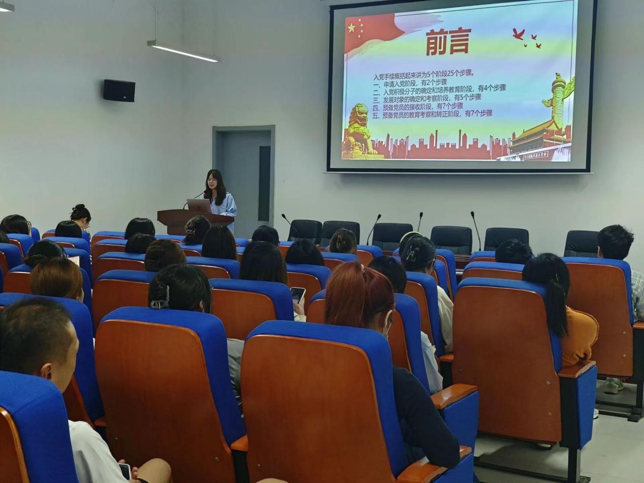 随后,学生代表刘嘉怡就申请入党阶段、入党积极分子的确定和培养阶段、发展对象的确定和考察阶段、预备党员的接受阶段、预备党员的教育考察和转正阶段五个阶段进行入党专业知识的培训。其中,刘嘉怡同学着重强调入党的条件,必须是年满18岁的中国公民(即中国国籍),并且承认党的纲领和章程,愿意积极参加党的活动,积极拥护和执行党的决议。培训期间,学员们严格遵守培训纪律,认真听讲,积极思考,进一步加深对党的理论和历史的认识,提高自身的政治素养和业务能力,更加坚定了入党的信念和决心。