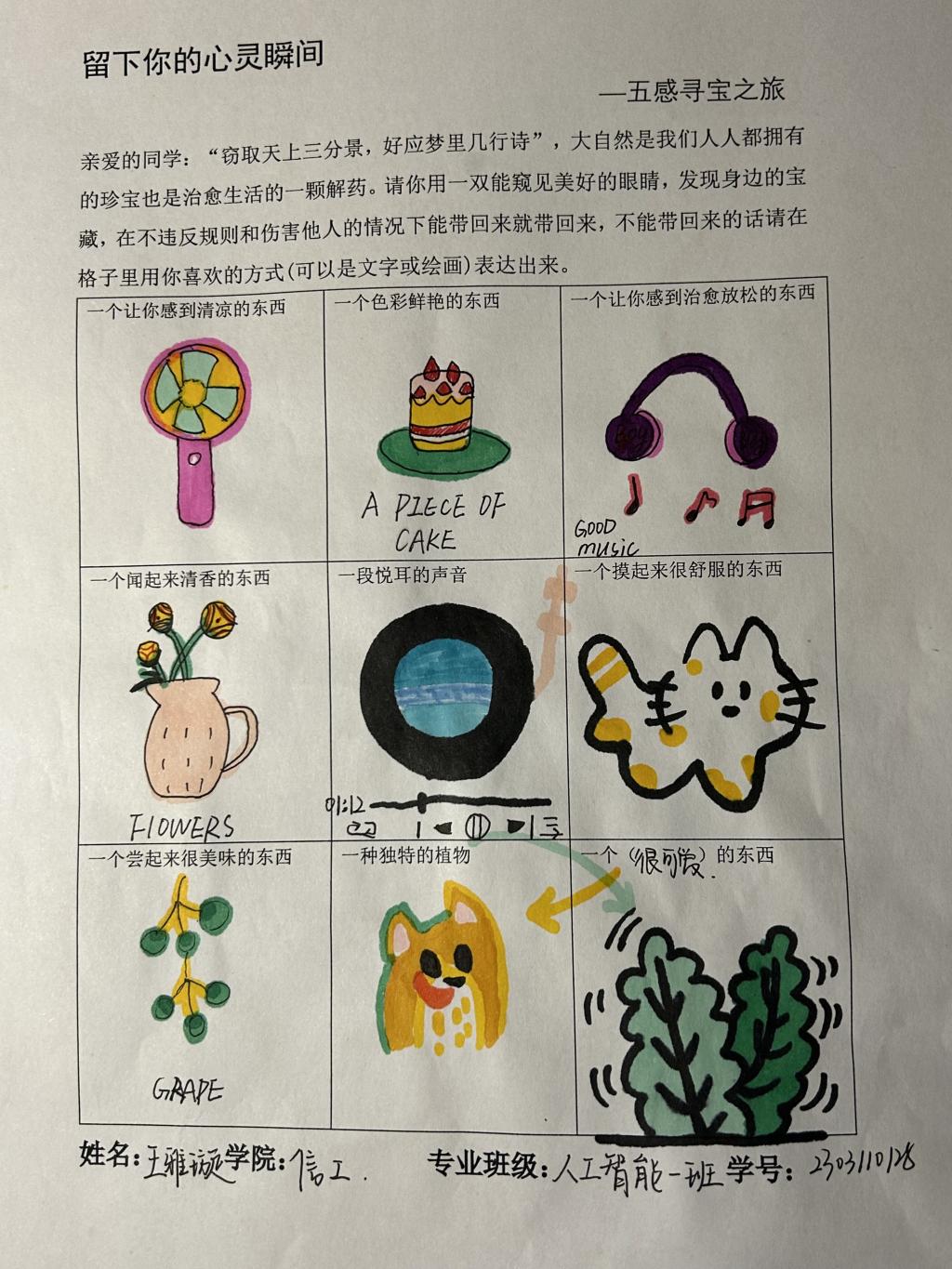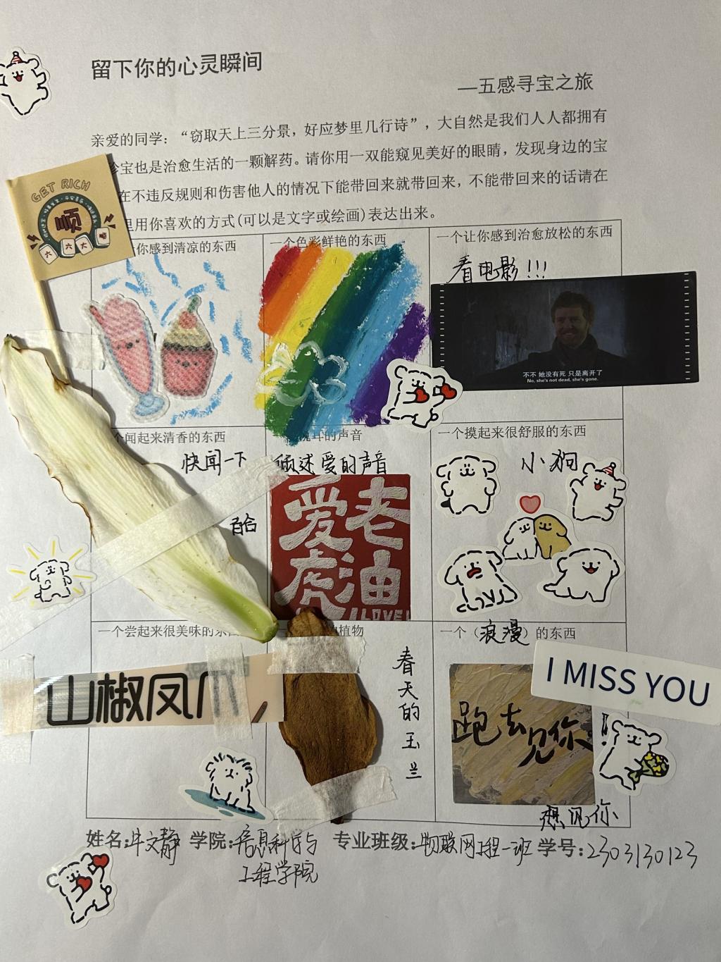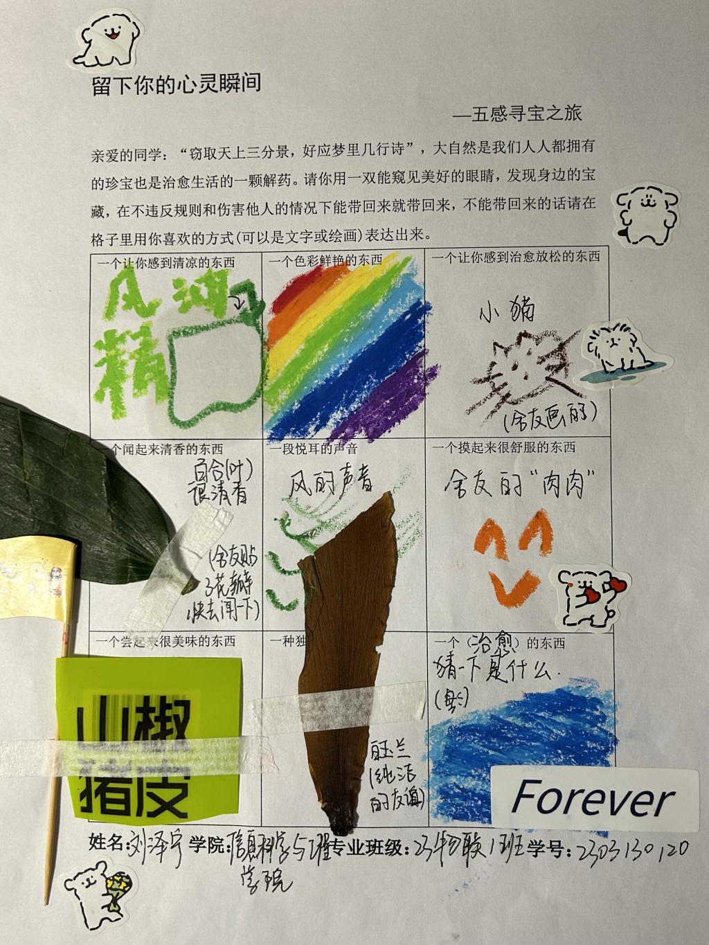 除了寻宝环节外,活动现场还设置了感官体验区和创意工坊。在感官体验区,他们通过触摸、嗅闻等方式,进一步感受了大自然的魅力。在创意工坊中,同学们利用收集到的宝物制作了精美的手工艺品,展现了他们的创意和动手能力。