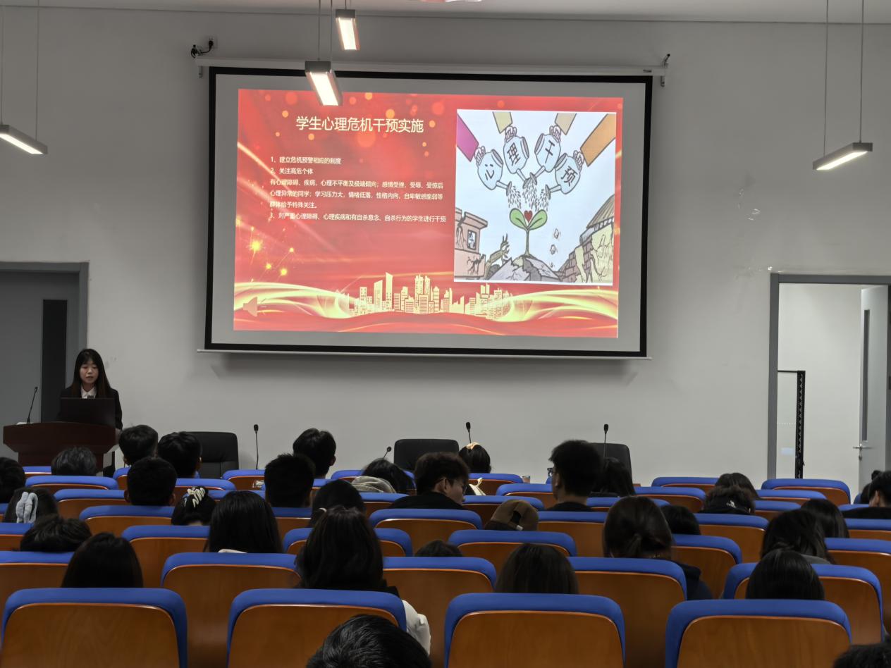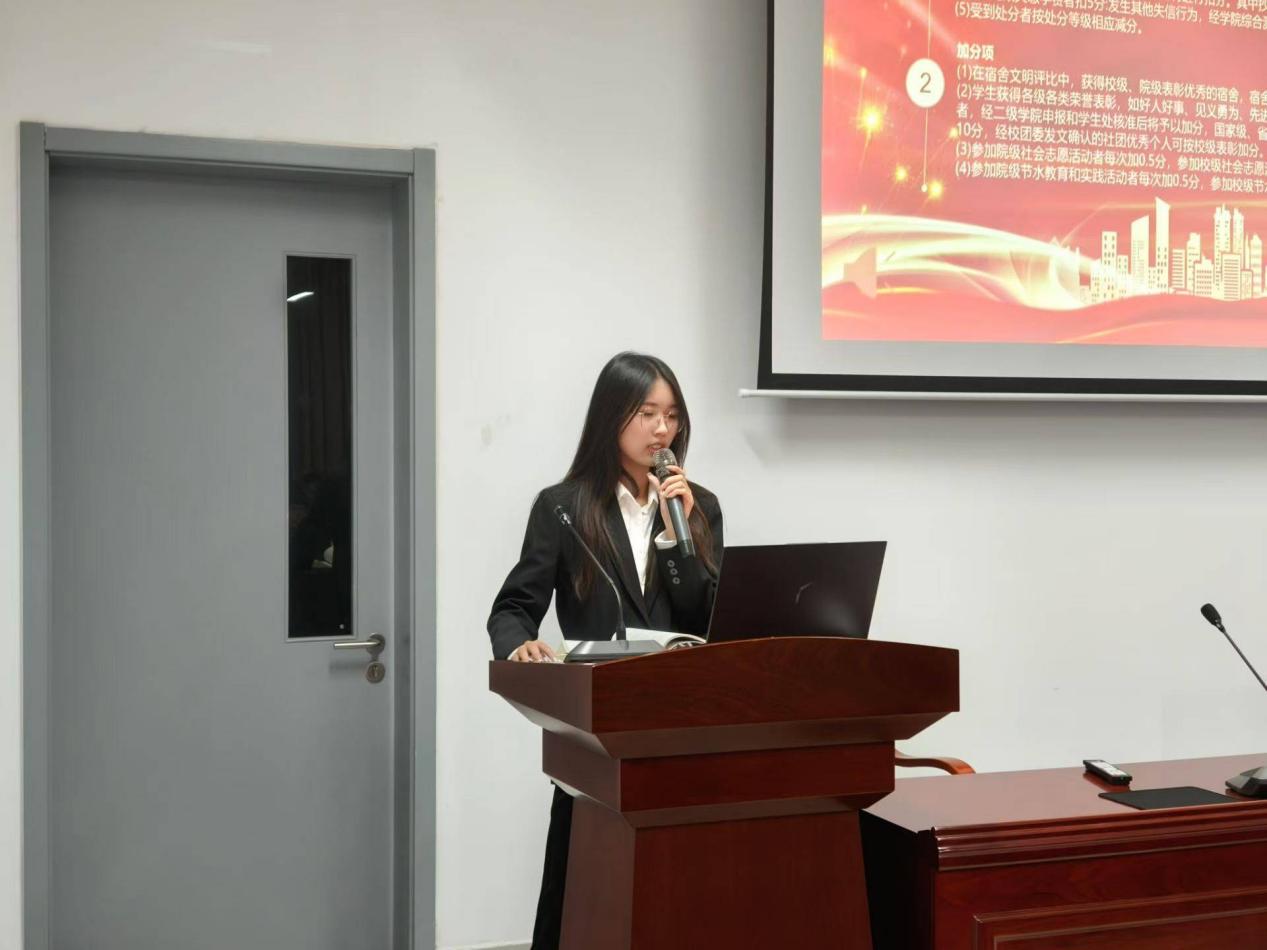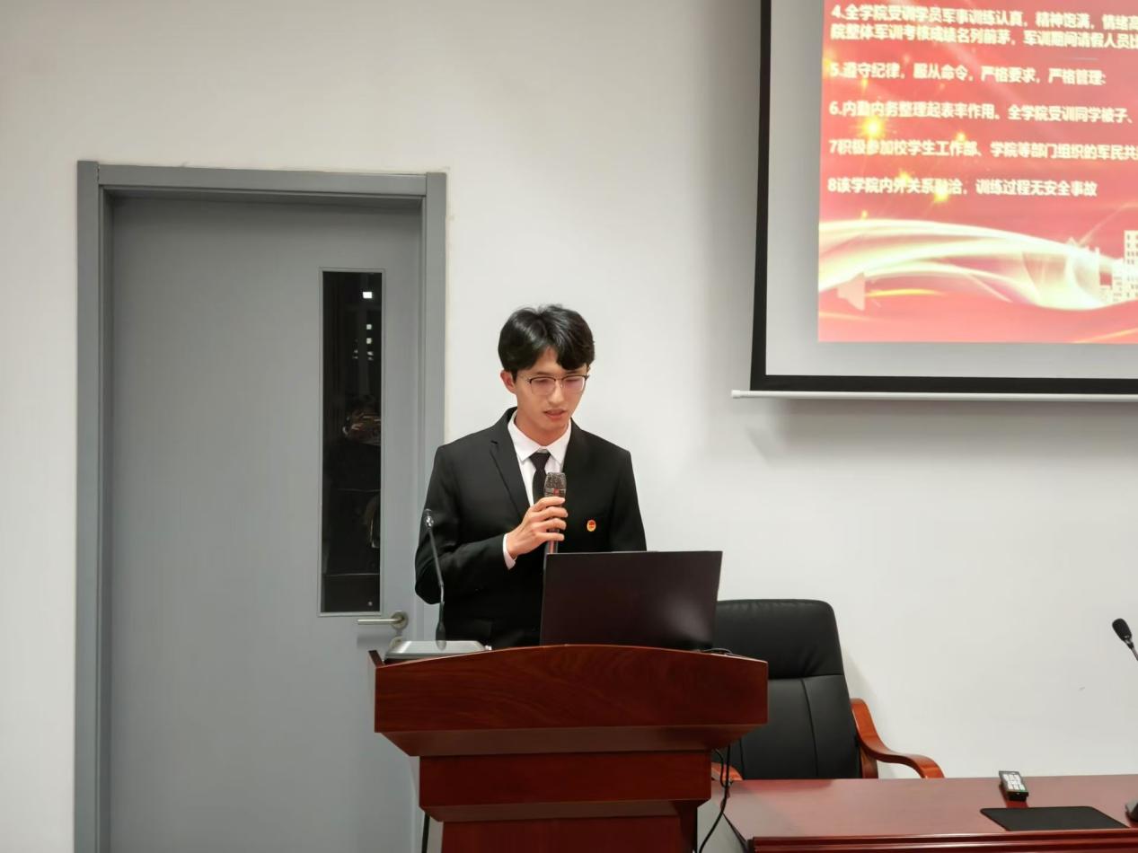 由文体部部长韩壮带领同学们回顾了新生军训先进集体和优秀学员评选的条件,然后就此对优秀同学的评选做出一系列讲解和答疑,他鼓励同学们以德为本。新闻编辑部的副部长王晓涵对大学生心理健康教育进行普及,她从心理健康教育四级工作网络规定、心理健康教育及危机干预管理、学生心理危机干预实施等方面详细科普,体现了学校对学生心理的密切关注和爱护。