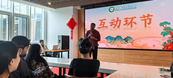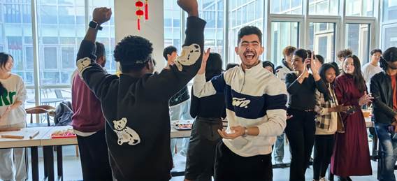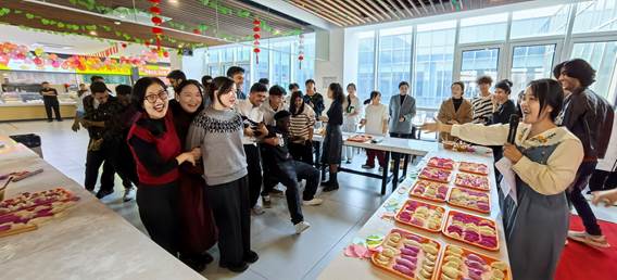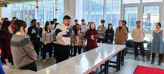 互动环节中,外国学生激情朗诵诗词,中国学生则迅速进行诗词接龙抢答。这不仅考验了大家的诗词储备,更增进了中外学生之间的默契与互动。每一位答对的同学都获得了抽取福包的机会,现场气氛热烈非凡。而最令人期待的当属“好运爆棚”环节,吃到“糖果饺子”的幸运儿们依次上台抽取福包,福包内的小礼品给大家带来了连连惊喜,将活动的欢乐氛围持续升温。活动接近尾声,全体师生合影留念,用镜头定格这一珍贵的瞬间,记录下中外学子在冬至佳节结下的深厚情谊。