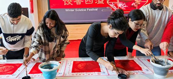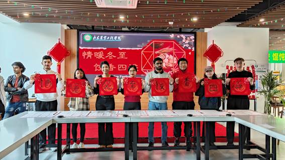 在书法展示环节,国际学生们挥毫泼墨,书写“情暖冬至,饺香四溢”。他们一笔一划认真书写,尽管笔触略显生疏,但那份对中国书法文化的热忱与专注令人动容。书法老师细致点评后,为表现出色的学生颁发了精美的书法奖品,台下掌声雷动。