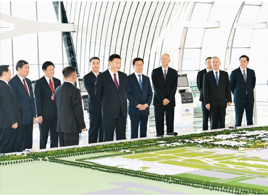 2019年9月25日上午,北京大兴国际机场投运仪式在北京举行。中共中央总书记、国家主席、中央军委主席习近平出席仪式,宣布机场正式投运并巡览航站楼。这是习近平在综合交通中心听取机场综合交通体系建设情况介绍。 新华社记者 谢环驰/摄