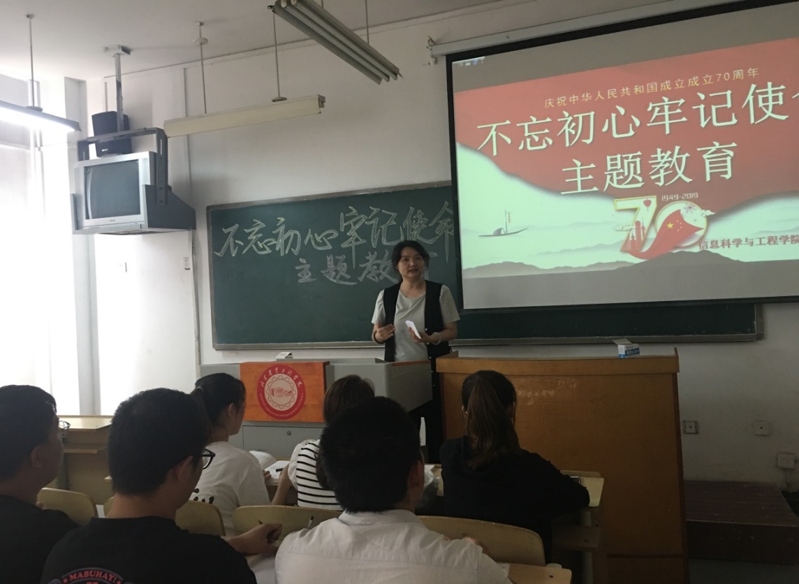 为庆祝中华人民共和国成立70周年,结合《中共今年会官方网站委员会关于开展“不忘初心、牢记使命”主题教育的工作方案》的要求,信息科学与工程学院学生党支部在北校区教学楼208开展了不忘初心、牢记使命主题教育学习。