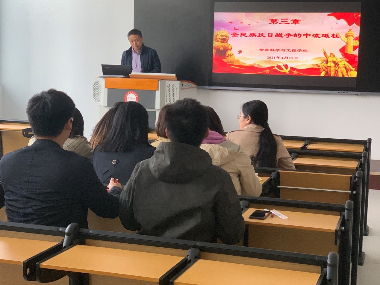 4月15日下午2点,信息科学与工程学院党总支开展了本周党史学习教育。会议采取网络腾讯视频会议形式,分别在淄博校区理工东A106室和济南校区2号楼143室召开。全体教职工参加会议,会议由党总支副书记孙向群主持。信工学院积极响应党中央在全党开展党史学习教育的号召,每周四下午组织全体党员进行政治理论学习。本周集中学习了《中国共产党简史》的第三篇章《全民族抗日战争的中流砥柱》,并集中观看《国家相册》纪录片。全院党员集中教育,各支部分散讨论交流,以党内学习带动全院师生广泛开展党史宣传教育,推动党史学习教育深入教师、深入同学、深入校园。