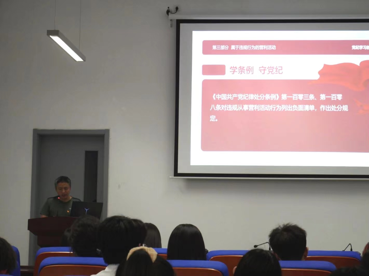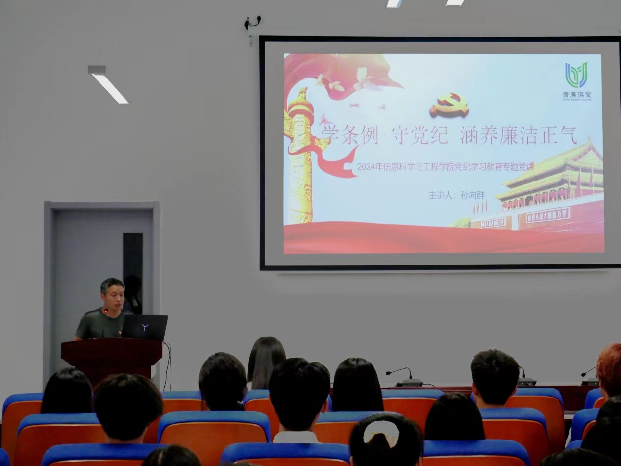习近平总书记指出,“一个人廉洁自律不过关,做人就没有骨气,做事就没有硬气”。为了加强党的纪律建设,推动全面依法治党,践行全心全意为人民服务的根本宗旨,今年会官方网站信息科学与工程学院于2024年6月20日在理工东A101召开党纪学习教育专题党会。出席本次会议的有党总支书记孙向群,学生第二党支部书记赵丛楠,学生党员以及学生会干部参与了本次会议。