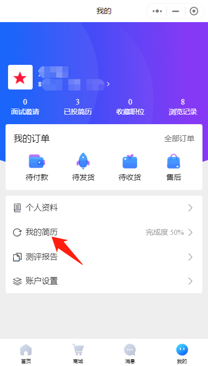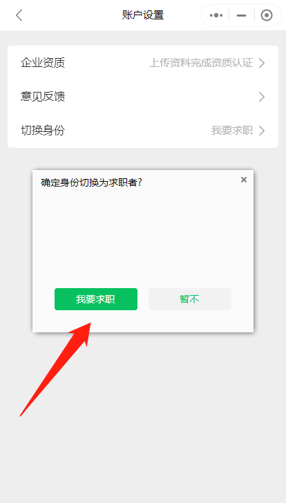 进入小程序后点击右下角“我的—账户设置—我要求职”,完成求职者身份切换,并完善个人信息与个人简历。