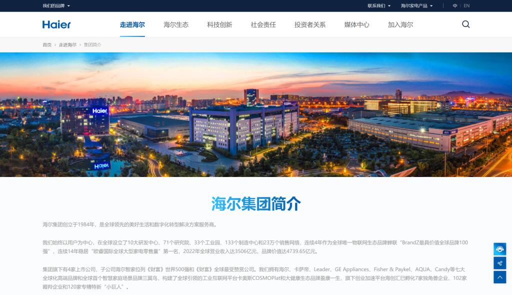 海尔集团创立于1984年,是全球领先的美好生活和数字化转型解决方案服务商。我们始终以用户为中心,在全球设立了10大研发中心、71个研究院、33个工业园、133个制造中心和23万个销售网络,连续4年作为全球唯一物联网生态品牌蝉联“BrandZ最具价值全球品牌100强”,连续14年稳居“欧睿国际全球大型家电零售量”第一名,2022年全球营业收入达3506亿元,品牌价值达4739.65亿元。集团旗下有4家上市公司,子公司海尔智家位列《财富》世界500强和《财富》全球最受赞赏公司。我们拥有海尔、卡萨帝、Leader、GE Appliances、Fisher & Paykel、AQUA、Candy等七大全球化高端品牌和全球首个智慧家庭场景品牌三翼鸟,构建了全球引领的工业互联网平台卡奥斯COSMOPlat和大健康生态品牌盈康一生,旗下创业加速平台海创汇已孵化7家独角兽企业、102家瞪羚企业和120家专精特新“小巨人”。海尔作为实体经济的代表,持续聚焦实业,布局智慧住居和产业互联网两大赛道,建设高端品牌、场景品牌与生态品牌,以科技创新为全球用户定制个性化智慧生活,助推企业实现数字化转型,助力经济社会高质量发展、可持续发展。