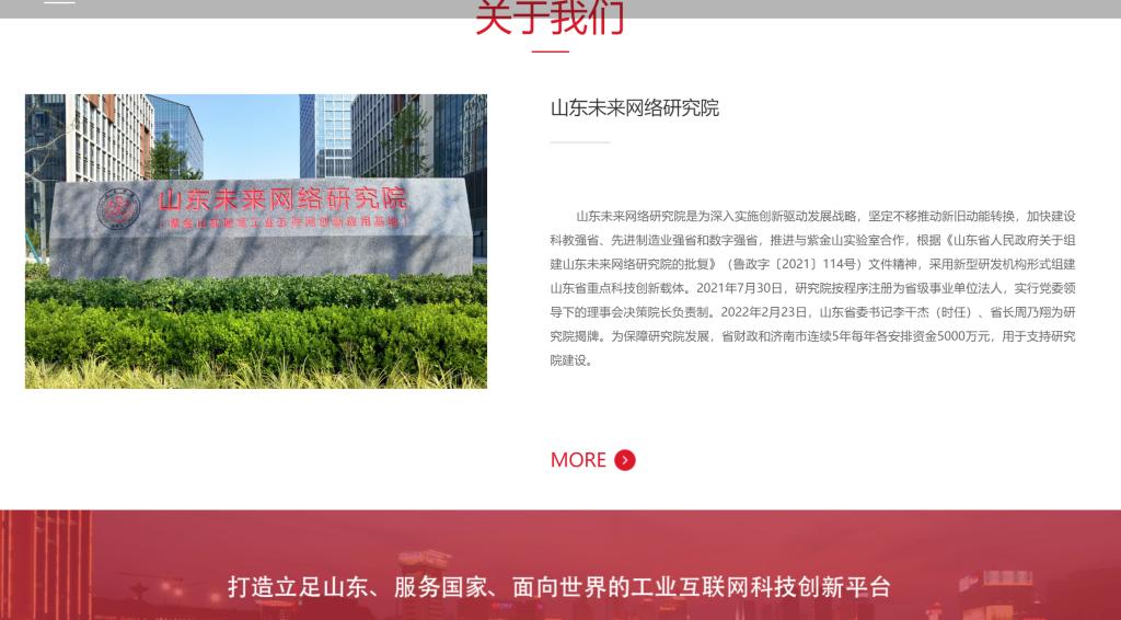 山东未来网络研究院是采用新型研发机构形式组建的事业单位。面向国际技术前沿、面向国家重大战略需求和国内经济主战场,采用‘院企一体化’模式,将研究院打造成立足山东、服务国家、面向世界、研发转化体系健全、对接国际水平的工业互联网重大科技创新平台。以未来网络关键技术研究和原始创新为核心,解决一批工业互联网共性关键技术‘卡脖子’问题,同时围绕市场需求,打造一批跨学科、前瞻性科技创新联合实验室,加快核心技术产业化布局。