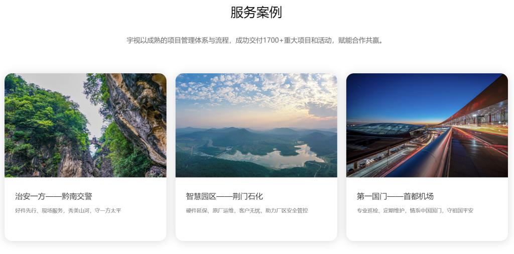 截至2021年底,宇视建设智慧城市470余个,平安工程930余个,智能交通项目480余个,平安高校700余所(85%双一流高校,90%教育部直属高校),43个城市的180余条地铁线路,80余个机场,大型企业500余家,三甲医院240余家,高速公路330余条,300余个地标性商业综合体建筑。在几乎中国所有重大峰会(APEC、G20、上合、金砖)、历史时刻(人大、两会)、国际体育赛事(北京冬奥会、杭州亚运会、俄罗斯世界杯)的场景,在张学友演唱会的抓逃,都有宇视的守护;交付的产品方案覆盖全球200余个国家和地区,3000余个城市。