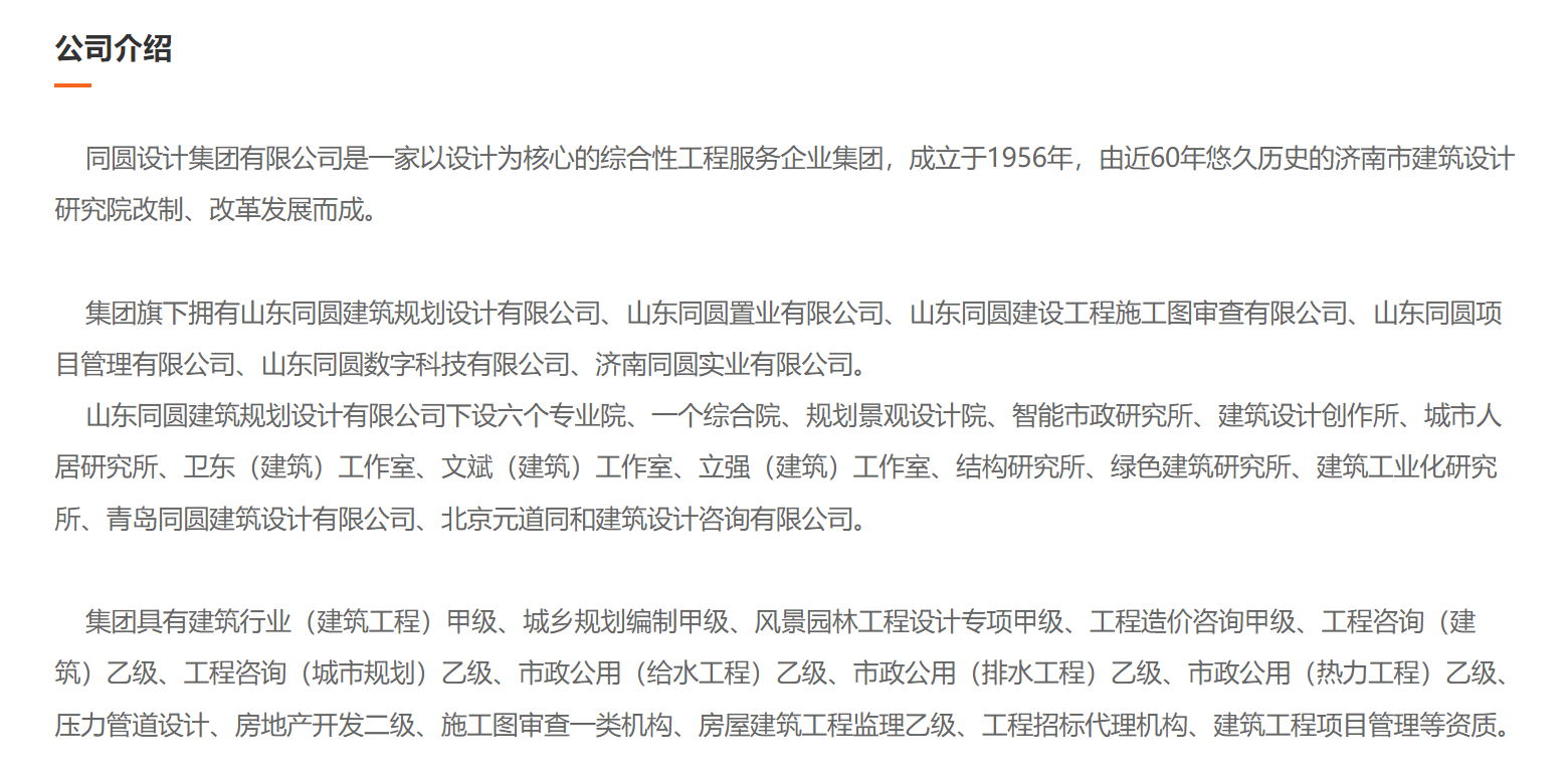 同圆设计集团有限公司是一家以设计为核心的综合性工程服务企业集团,成立于1956年,由近60年悠久历史的济南市建筑设计研究院改制、改革发展而成。集团旗下拥有山东同圆建筑规划设计有限公司、山东同圆置业有限公司、山东同圆建设工程施工图审查有限公司、山东同圆项目管理有限公司、山东同圆数字科技有限公司、济南同圆实业有限公司。山东同圆建筑规划设计有限公司下设六个专业院、一个综合院、规划景观设计院、智能市政研究所、建筑设计创作所、城市人居研究所、卫东(建筑)工作室、文斌(建筑)工作室、立强(建筑)工作室、结构研究所、绿色建筑研究所、建筑工业化研究所、青岛同圆建筑设计有限公司、北京元道同和建筑设计咨询有限公司。