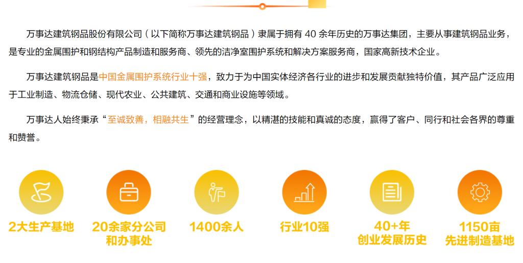 万事达建筑钢品股份有限公司(以下简称万事达建筑钢品)隶属于拥有40余年历史的万事达集团,主要从事建筑钢品业务,是专业的金属围护和钢结构产品制造和服务商、领先的洁净室围护系统和解决方案服务商,国家高新技术企业。万事达建筑钢品是中国金属围护系统行业十强,致力于为中国实体经济各行业的进步和发展贡献独特价值,其产品广泛应用于工业制造、物流仓储、现代农业、公共建筑、交通和商业设施等领域。万事达人始终秉承“至诚致善,相融共生”的经营理念,以精湛的技能和真诚的态度,赢得了客户、同行和社会各界的尊重和赞誉。