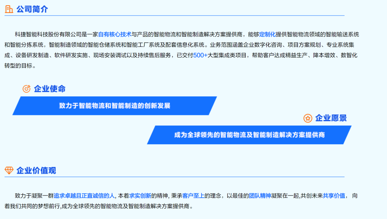 科捷智能科技股份有限公司是一家自有核心技术与产品的智能物流和智能制造解决方案提供商。业务范围涵盖企业数字化咨询、项目方案规划、专业系统集成、设备研发制造、软件研发实施、现场安装调试及持续售后服务。公司以数字化咨询为牵引,精益化管理为手段,通过对客户整体业务蓝图及架构规划,定制化提供智能物流领域的智能输送和智能分拣系统,智能制造领域的智能仓储和智能工厂系统及配套数字化软件系统。帮助客户实现从物流、仓储到整体工厂三位一体的自动化、智能化升级。