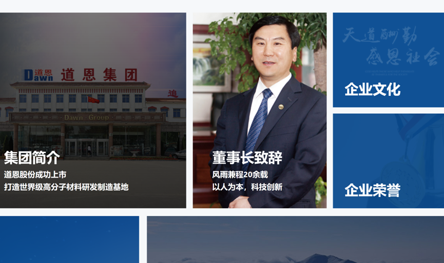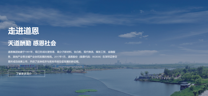 道恩集团始建于1991年,是国家级企业集团,辖设20个成员单位,员工2000余人。二十年来,集团公司紧紧围绕市场需求,着眼于企业的长远发展,以道恩经济园为载体,科学构建了塑料商贸板块、新材料加工与应用板块、钛白粉板块、物流煤炭板块、建筑建材板块、旅游餐饮板块,精心培育了改性塑料、热塑性弹性体、精密模具等高新技术产业,相继建设了山东省塑胶弹性体工程技术研究中心、国家级企业技术中心和山东道恩塑料研究院、道恩-北化联合实验室等自主创新研发平台。通过了ISO9001 :2008质量管理体系认证、ISO/TS16949质量管理体系认证和CNAS国家实验室认证;先后被认定为中国优秀民营科技企业、山东省先进民营企业、山东省高新技术企业、山东省文明单位、山东省守合同重信用企业、山东省诚信企业、山东省就业和社会保障先进单位、山东省商业十大品牌企业,荣获国家技术发明二等奖、中国民营科技企业技术创新奖。“道恩”牌商标为山东省著名商标。