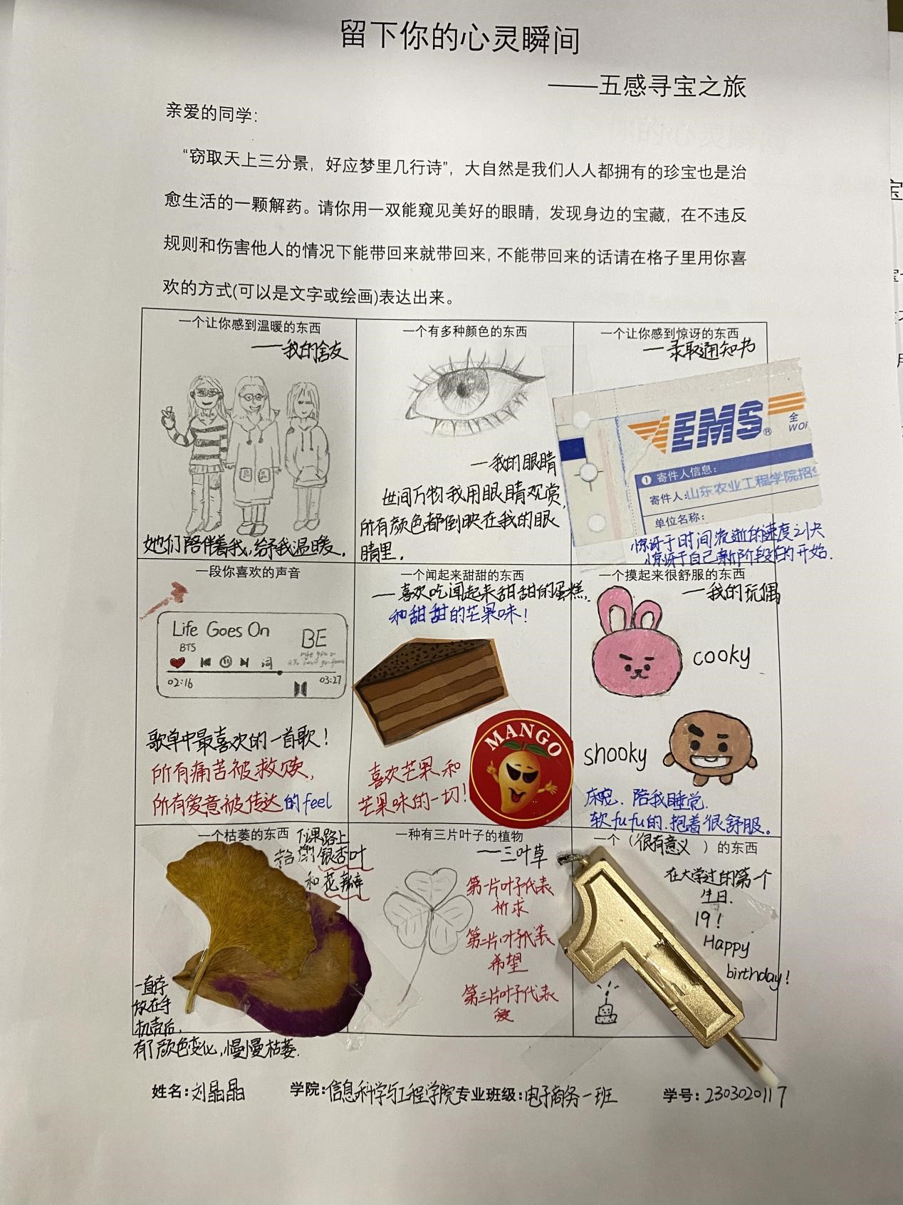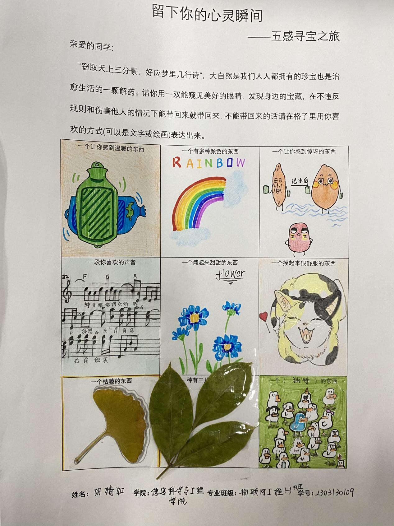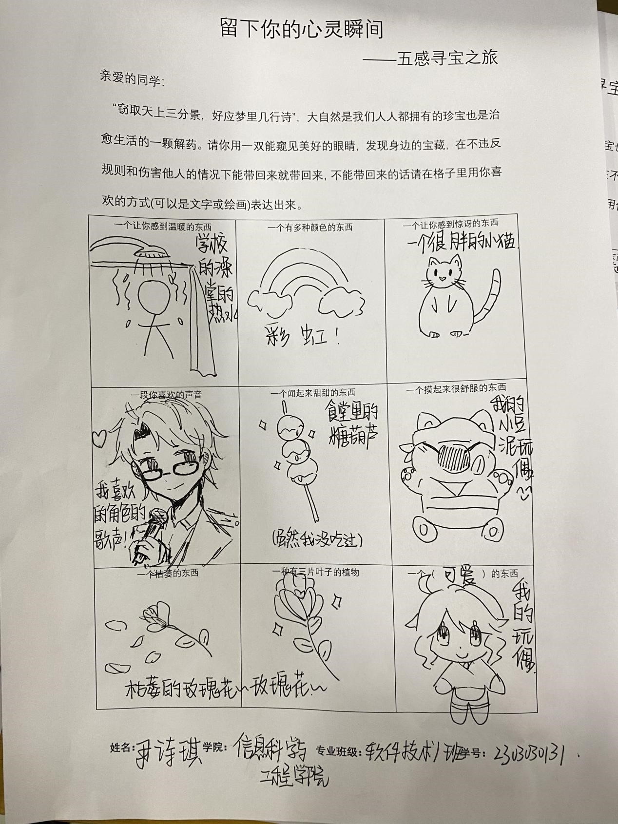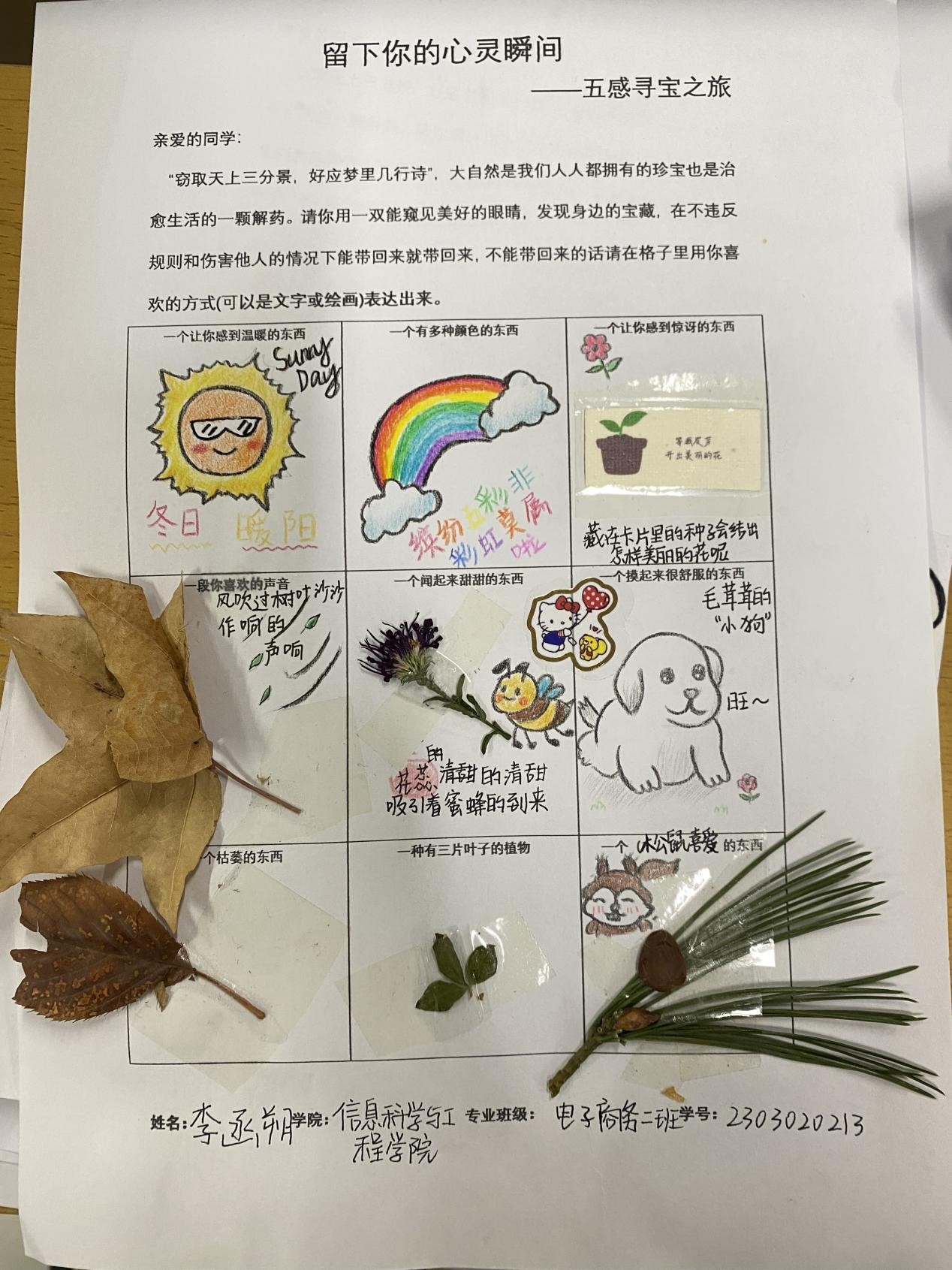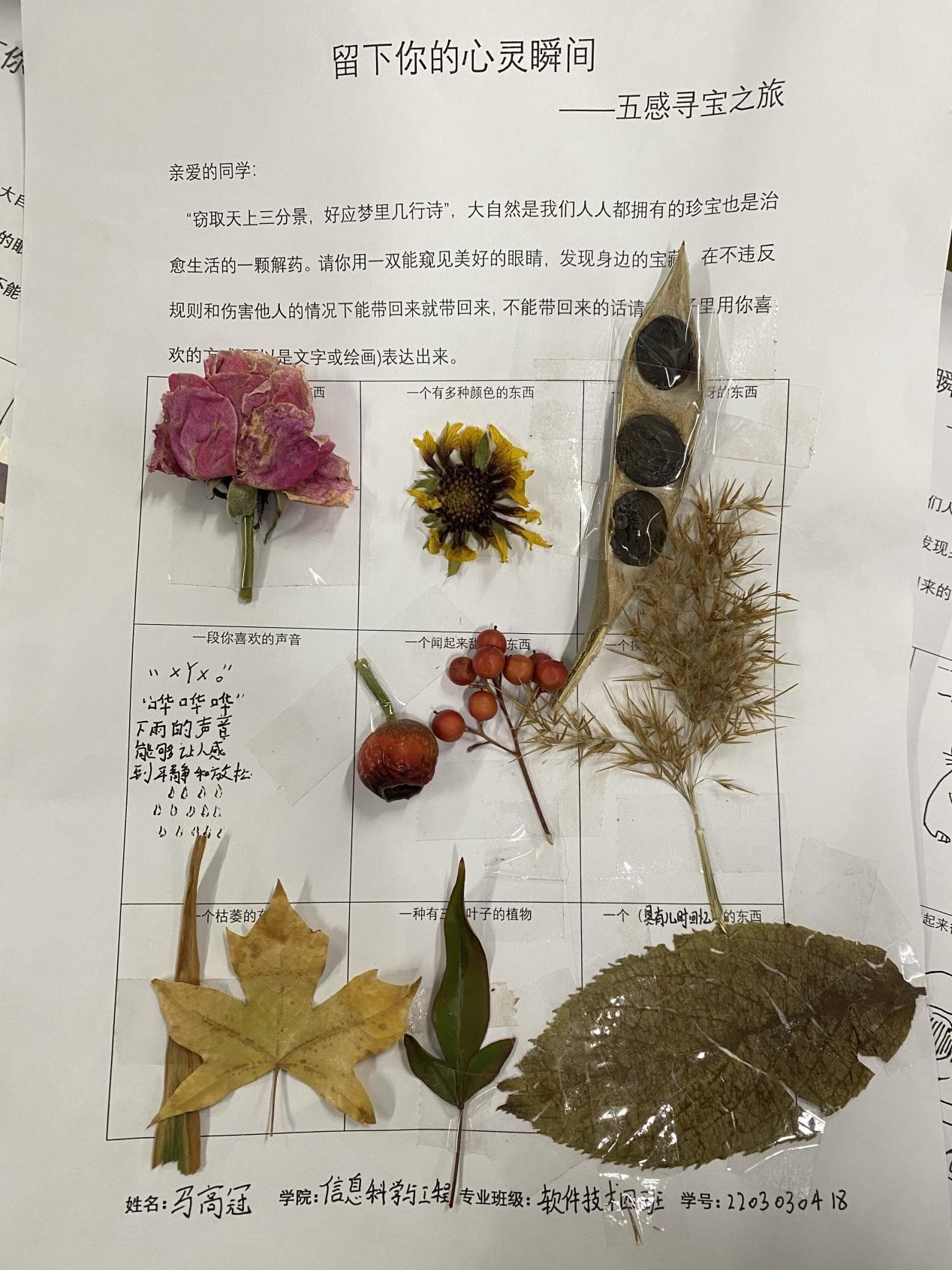 此活动使用一个自由且积极的方式,让同学们能够在校园内找到独属自己的宝藏,寄托自己心灵触动的瞬间。各位同学也充分的利用课余时间,参与到了本次活动中。“窃取天上三分景,好应梦里几行诗”,大自然是我们人人都拥有的珍宝,也是治愈生活的一颗解药。大家用一双能窥见美好的眼睛,寻找身边的宝藏。或是物品的原样,或是文字绘画,“宝藏”被同学们认真细心的展示在活动表格中。一张张活动的表格生动展现出了同学们的寻宝之旅,寄托出了自己心灵触动的瞬间。通过本次心理活动,同学们更好地了解自己的性格,兴趣爱好,价值观等。在寻宝探索的过程中,大家感受到了自然与生活的乐趣与挑战。同时也提高了大家对未来生活的期待,更加珍惜身边的每一个精彩瞬间与回忆。