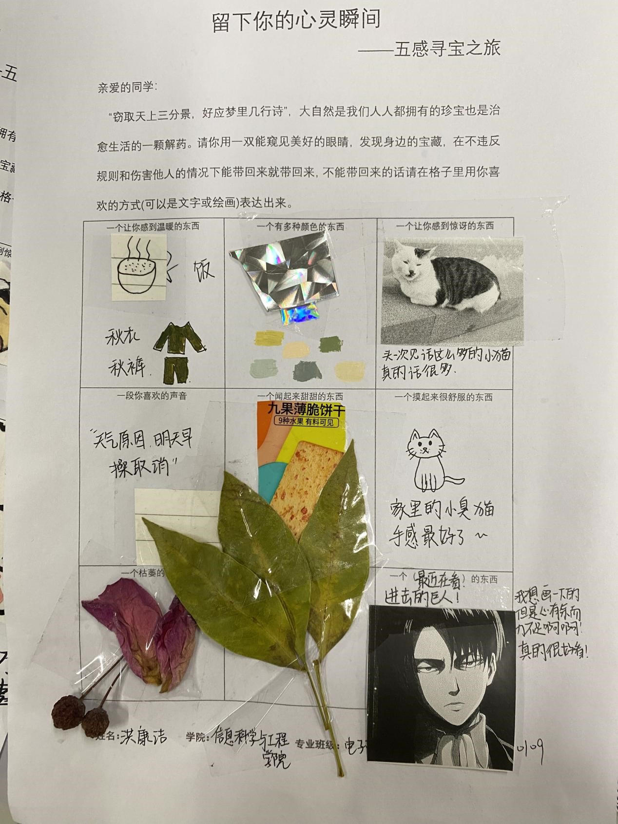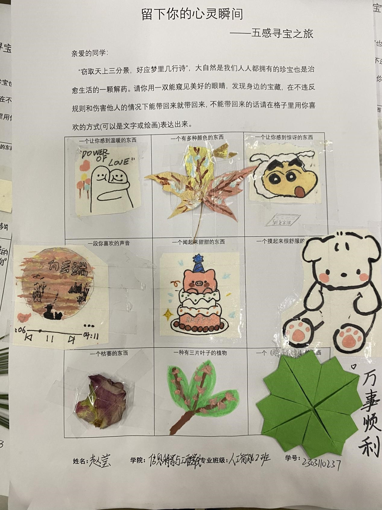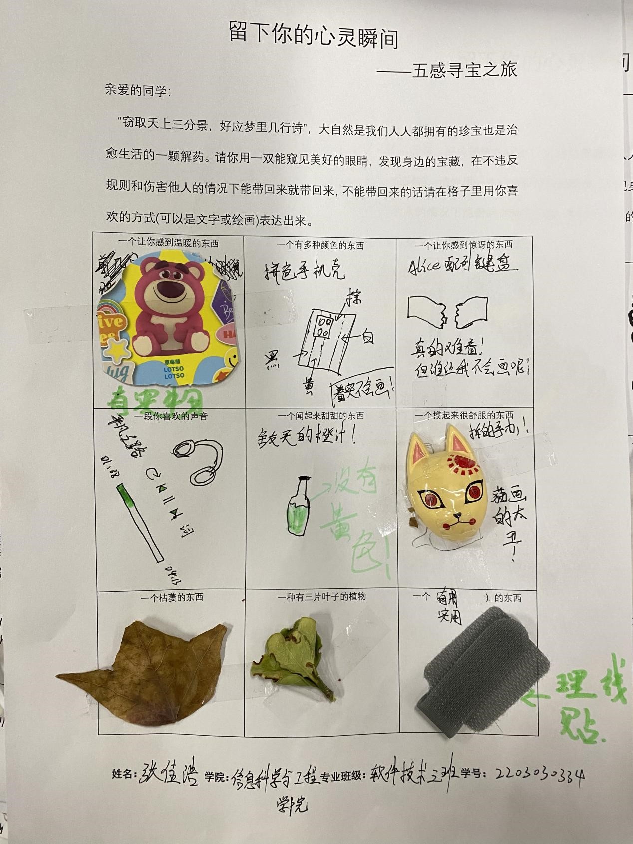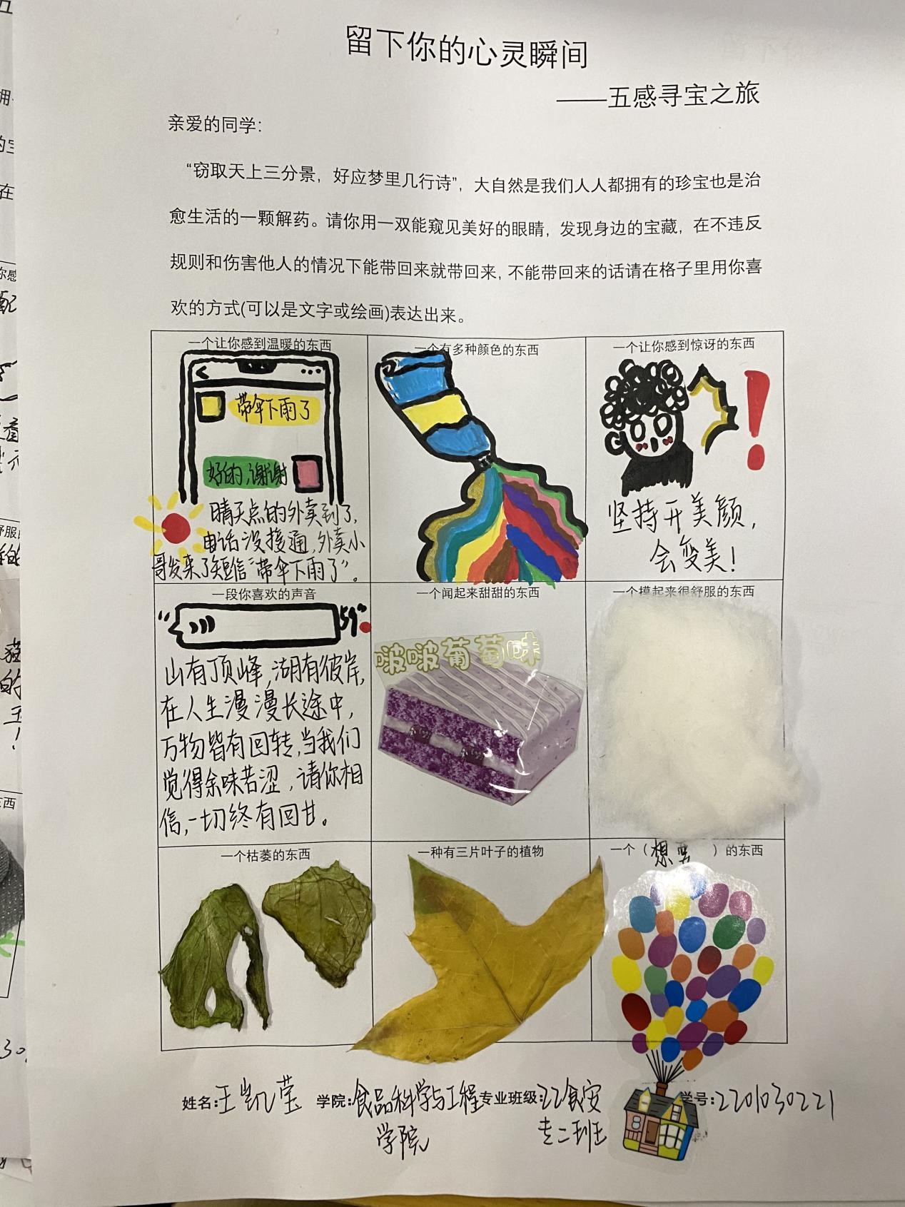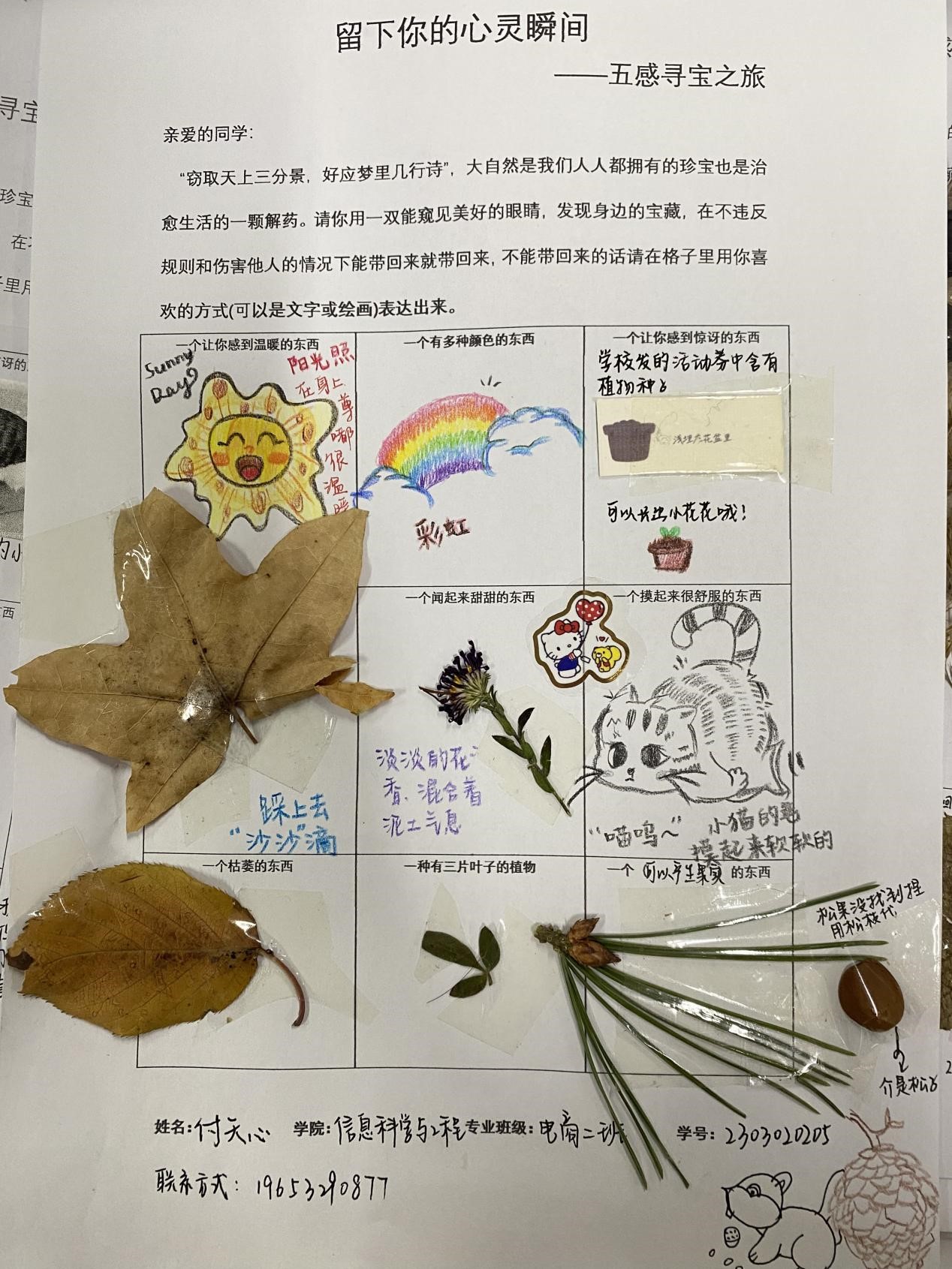 此活动使用一个自由且积极的方式,让同学们能够在校园内找到独属自己的宝藏,寄托自己心灵触动的瞬间。各位同学也充分的利用课余时间,参与到了本次活动中。“窃取天上三分景,好应梦里几行诗”,大自然是我们人人都拥有的珍宝,也是治愈生活的一颗解药。大家用一双能窥见美好的眼睛,寻找身边的宝藏。或是物品的原样,或是文字绘画,“宝藏”被同学们认真细心的展示在活动表格中。一张张活动的表格生动展现出了同学们的寻宝之旅,寄托出了自己心灵触动的瞬间。通过本次心理活动,同学们更好地了解自己的性格,兴趣爱好,价值观等。在寻宝探索的过程中,大家感受到了自然与生活的乐趣与挑战。同时也提高了大家对未来生活的期待,更加珍惜身边的每一个精彩瞬间与回忆。