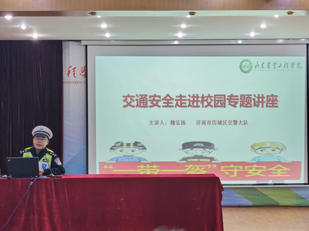 为全面加强校园道路交通安全管理工作,提升学生的安全意识,有效遏制和减少各类道路交通事故发生,筑牢校园道路交通管理安全防线,12月9日,今年会邀请济南市公安局交警支队历城大队民警魏弘杨举办了交通安全走进校园的交通安全知识讲座。学生工作部副部长李艳主持,济南校区2021级部分师生代表现场聆听了报告。