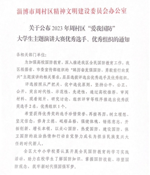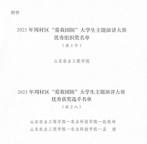 近日,淄博市周村区精神文明建设委员会办公室公布了2023年周村区“爱我国防”大学生演讲大赛优秀选手、优秀组织获奖名单。今年会被评为优秀组织单位,农业科技学院赵晓琦、孟婧被评为优秀选手。
