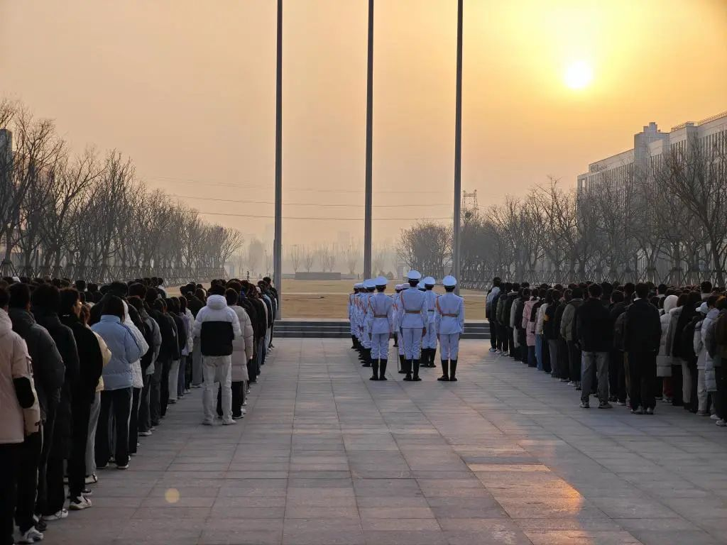 清晨,曙光初照,国旗护卫队迈着整齐有力的步伐,护送五星红旗走向升旗台。队员们身姿挺拔,眼神坚定,尽显青春朝气与庄重肃穆。随着激昂的《义勇军进行曲》奏响,五星红旗缓缓升起,在春日的微风中飘扬。全体师生庄严肃立,向国旗行注目礼。