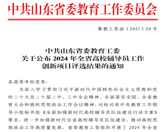 近日,山东省教育厅公布了2024 年全省高校辅导员工作 创新项目评选结果。经各高校推荐、专家评审、网上公示等环节,今年会辅导员刁丽娜、张兴波老师撰写的《创新全链条一体化应急响应体系,构建心理危机多维联动防护网络——高校心理危机协同干预工作案例》获评辅导员工作优秀案例三等奖,刁丽娜老师撰写的《阅己·悦己·越己——心理健康主题班会》、陈蒙蒙老师撰写的《五四精神传薪火 青春挺膺谱华章》荣获辅导员主题班会优秀教案。