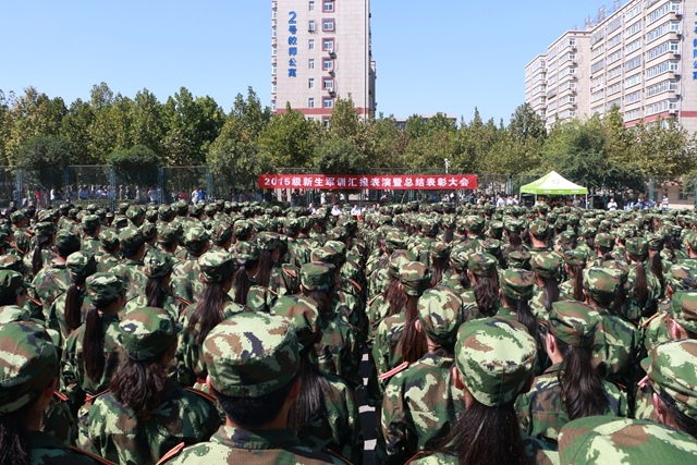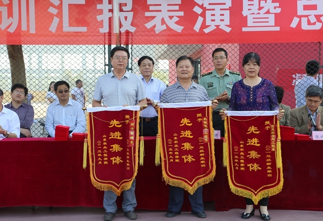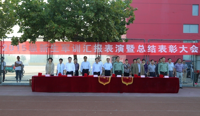9月20日上午,我院2015级新生军训汇报表演暨总结表彰大会分别在济南和北校区体育场隆重举行。党委副书记、院长李允祥,党委委员、副院长林松柏,副院长张兆明,纪委书记杨永欣以及承训部队参谋长郝继明、副参谋长贺业水出席大会,有关处室和各系部负责人参加大会并观看了汇报表演。院长李允祥向承训部队赠送了锦旗,并与出席大会的院领导、部队首长一起为军训获奖单位和个人以及优秀新生颁奖。副院长张兆明主持大会。