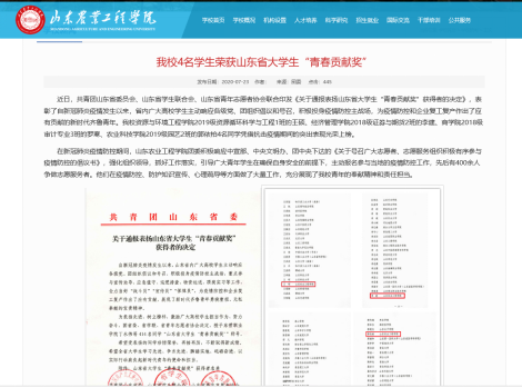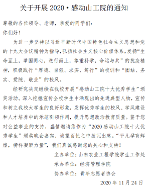 近年来,随着学校各项工作的稳步开展,山东农业工程学院有很多优秀的青年大学生在大学这个舞台上发光发亮。山工院学子用自己的行动渲染了亮丽的青春底色,高亢的唱响了一曲曲校园精神文明建设的赞歌。特别是在今年疫情期间,山工院学子积极响应国家号召,用自己的方式,为学校及社会的防疫战线做出了突出的贡献,产生了积极影响,展现了当代青年应有的社会责任,获得了广大师生及社会各界人士的一致好评。为了营造良好的教风、学风及校风,更好地推动校园先进文化建设,经校学生工作处研究,决定在全校开展“2020·感动山工院十大优秀学生”评选活动。