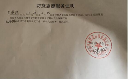 他通过红十字官方为防疫工作捐款捐物。2020年2月份,他跟随参与防疫物资运输。2020年3月份他参与镇政府组织的优秀疫情志愿者会议并于3月16日得到市政府的表扬和提名。4月至6月,王琛参与村委会和镇政府的疫情资料整理和汇总工作,得到证明、表扬以及锦旗。