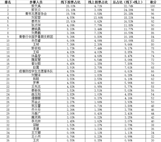 利用青年志愿者协会小志微信公众号并结合在北校区2号教学楼下张贴进入大众评审阶段的参选者的参选材料,全校师生可根据实际情况对其进行网络投票及现场投票,为防止恶意刷票,该投票仅作为进入下一阶段的参评标准之一。“2020·感动山工院十大优秀学生”组委会会根据票数的排名,严格审核参选材料,在确保公平公正的基础上择优选出进入第三轮评选的参选者。