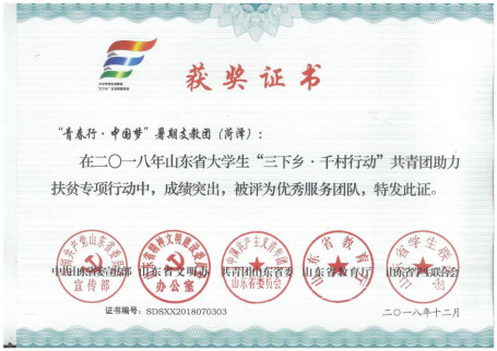 此次支教活动得到了共青团菏泽市委的支持,获得共青团菏泽市委颁发的优秀志愿者证书。;六年间,支教队在中青网等平台发出多篇优秀文章,支教队也曾多次荣获省优秀志愿服务团队,支教队员获省、市优秀志愿者的荣誉称号。