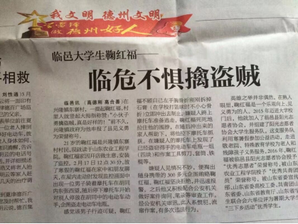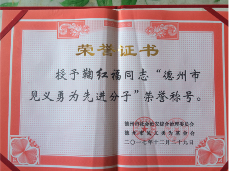 2017年2月17日中午,临邑县兴隆镇东寨村一电动车电瓶遭流窜犯罪分子盗窃。在屋内走动的鞠红福无意中从监控画面中看到那一幕,立即冲出对犯罪嫌疑人的盗窃行为进行了制止惊醒的嫌疑人欲驾车逃跑,却被鞠红福用刚拆掉石膏的手死死地拉住面对嫌疑人的金钱诱惑,他严词以拒,直到家人闻声赶来,将企图逃跑的犯罪嫌疑人交付于警察,绳之以法。