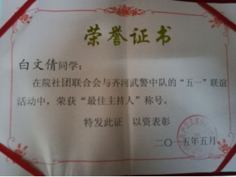在校学习期间,刻苦学习,多次荣获院奖学金。课余之时,积极参加各项文化工作:担任社联外联部部长、双节棍武术协会外联部部长、院文明指导队队长、“山工院团委公众号”的创始者之一,成功组织开展了“植树节联合新浪微博绿植活动”、社团文化节活动、齐河看守所联谊活动、院文明礼仪演讲比赛,使学校的社团文化更加丰富多彩。自立自强,为减轻家庭负担,闲暇之余兼职赚取生活费。