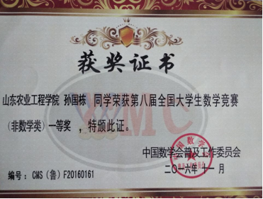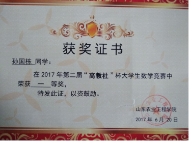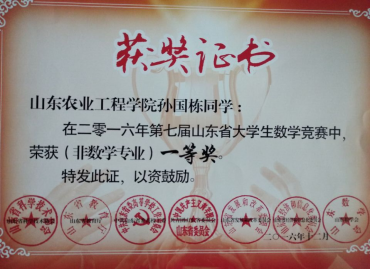大一大二27门必修课,平均分94.2,全专业排名第一,综合测评全班第一。2016年获省励志奖学金,2017年获省政府奖学金、山工院一等奖学金。2016年接连通过英语四级、六级,2016年过计算机二级、2017年过三级,2018年一次性通过教师资格证笔试、面试。数学、英语、数学建模,省赛国赛屡次获奖。并被评为“优秀团员干部”“优秀学生”等荣誉称号。
