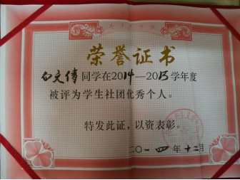 2015年创建青年志愿者协会支农部,2016年6月担任青年志愿者协会委员会委员长。任职期间不断完善协会人员选拔任用制度,扩充协会内部分化活动数量。在2016年暑假三下乡支教期间表现突出,并连续两年参加暑期支教活动,各方面表现突出被省委宣传部评为省优秀学生。在校印务店义务工作三年,熟练掌握办公软件。获得学校奖学金三等奖并参加主持教育部“国家大学生创业项目”,在《山西青年》发表论文一篇。