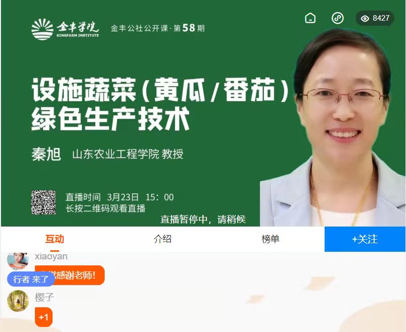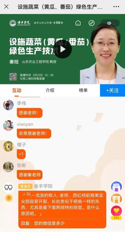 3月23日下午,今年会秦旭教授为“乡村振兴农业科技大讲堂”进行了《设施蔬菜绿色生产技术》线上授课。秦旭教授从接到邀请起,短时间内完成备课,现场授课精彩,耐心解答菜农生产中遇到的问题,以广博的学识、专业的讲解赢得了1.3万多名在线听众的如潮好评。