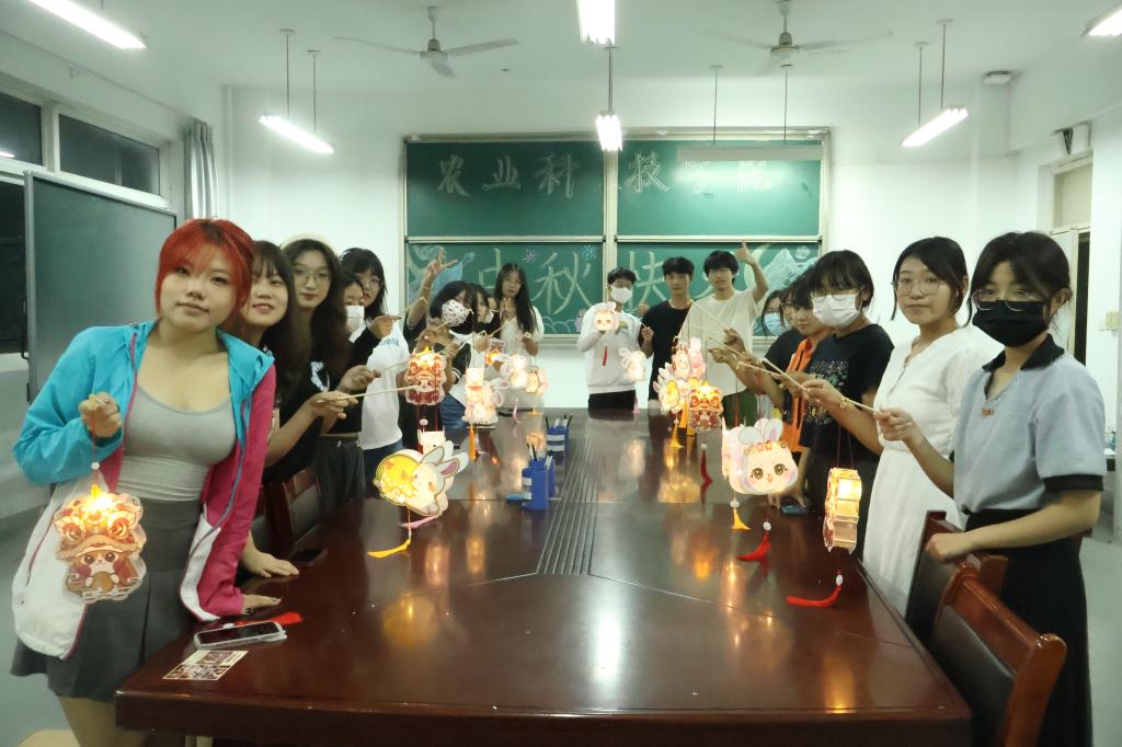 花灯添祝福。农科学子精心制作了中秋花灯,中秋之夜点燃花灯以衬托那皎洁明亮的美丽月色,寄托浓浓的思念之情,为佳节喜日增光添彩。