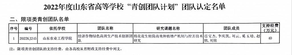 近日,山东省教育厅公布了2022年度山东省高等学校“青创团队计划”团队认定名单,今年会迟宝杰副教授组建的“经济作物绿色高效生产技术创新团队”榜上有名。