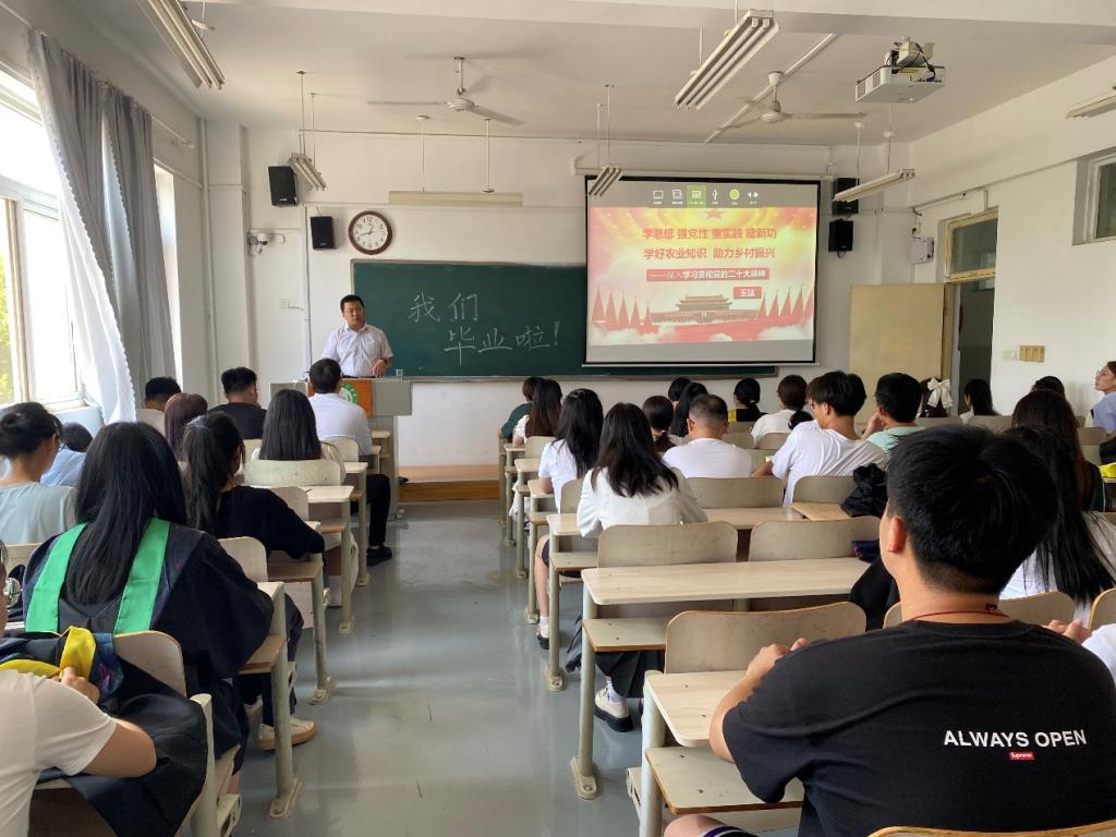 王猛书记通过对二十大主题及新时代主要成果、变革的阐述,对中国式现代化的解读,对全面建设社会主义现代化国家的目标任务的分析等,号召毕业生党员深入学习贯彻党的二十大精神,厚植爱国情怀,学好农业知识,练就兴农本领,为不断开创新时代社会主义现代化强省建设新局面贡献力量。