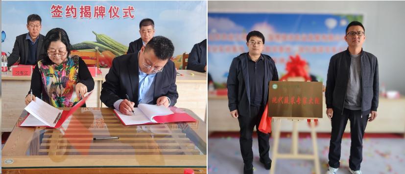仪式最后,王猛书记与张惠卿董事长签订《孙东文教授现代蔬菜专家大院合作协议》,潘凤兵科长与临淄区齐都镇政府王新稳副主任共同为专家大院揭牌。
