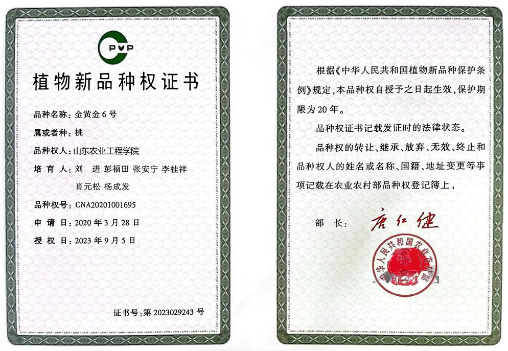 刘进教授带领团队以“抗氧化离核鲜食黄桃品种选育”为育种目标,历经20余年的攻关,成功构建金黄金系列早中晚熟品种体系,在高品质鲜食黄桃新品种选育及高效栽培技术创新等核心技术方面取得了重大突破。目前,‘金黄金’系列桃新品种已在山东、贵州、安徽、新疆、辽宁等全国适合桃栽培的区域推广种植14.30万亩,实现经济效益15.06亿元,‘金黄金’系列桃新品种成为了老百姓发家致富的“金蛋蛋”,为齐鲁特色林果产业转型升级注入新动能,为桃产业结构优化和乡村产业振兴提供了品种支持和技术保障。