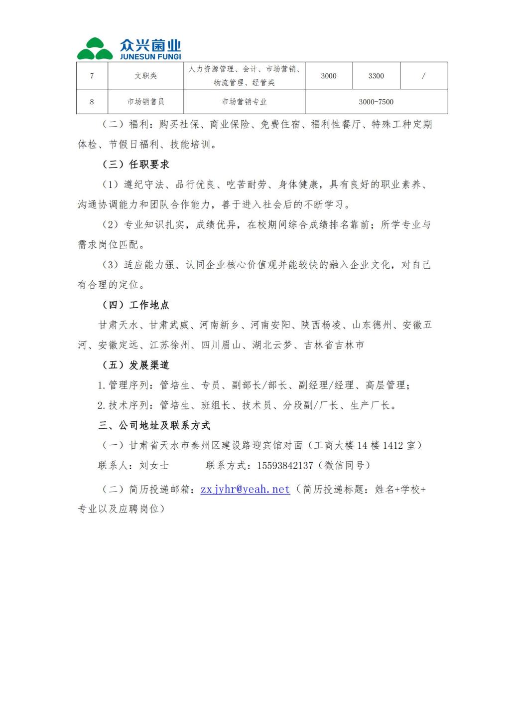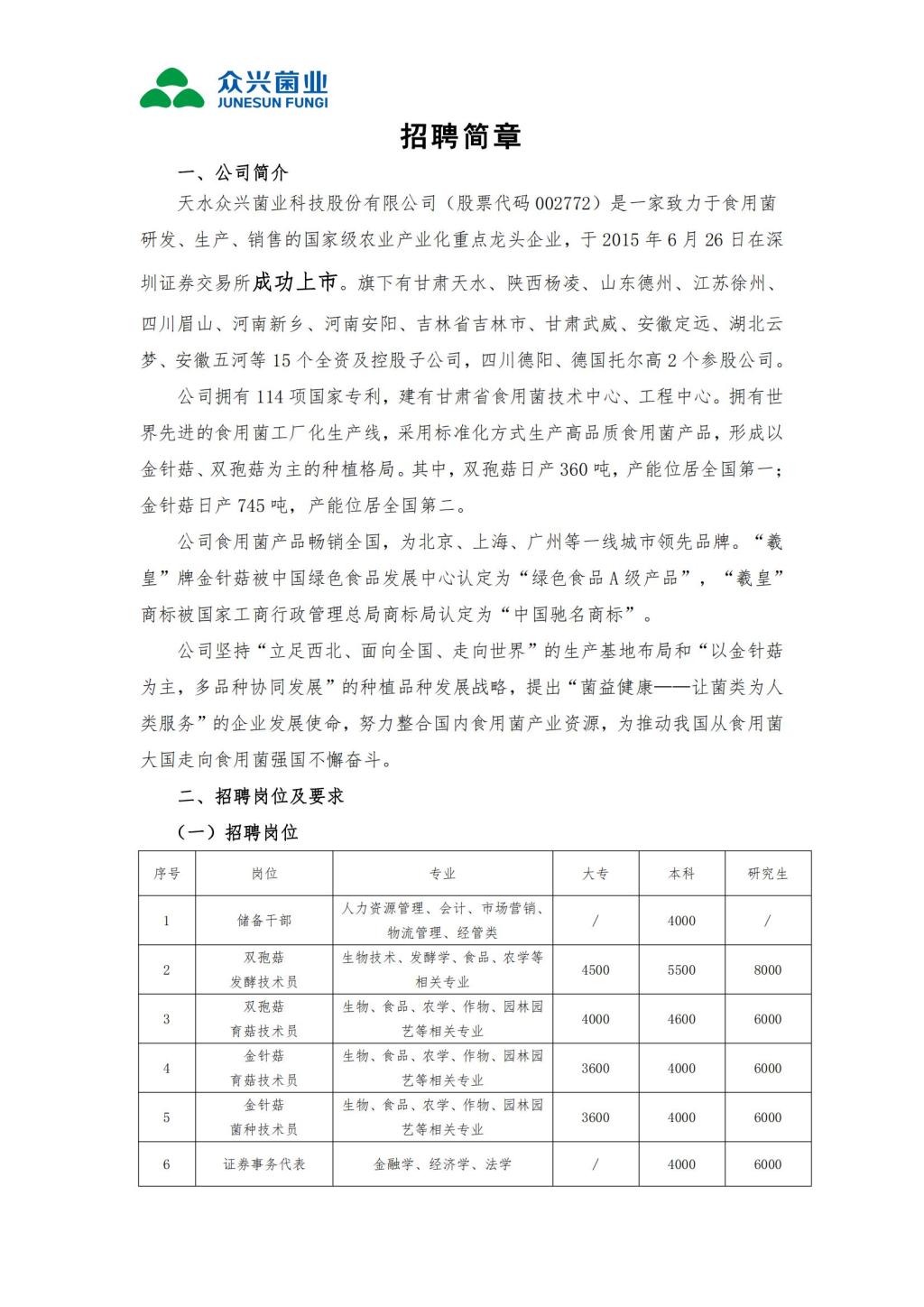 天水众兴菌业科技股份有限公司2022年招聘简章