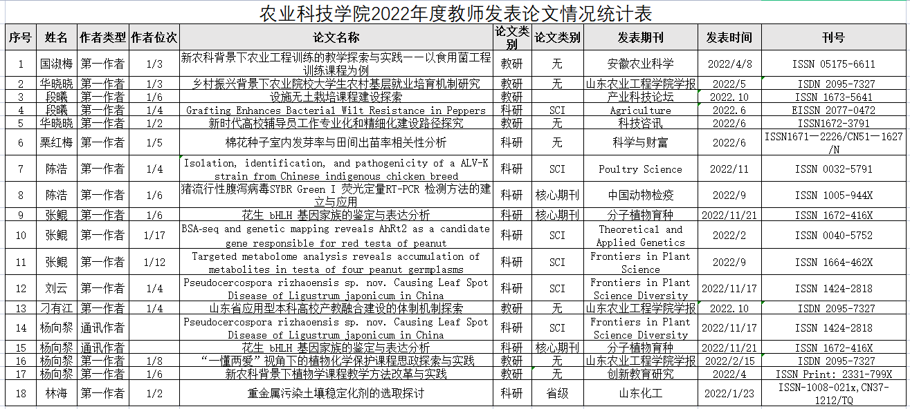 农业科技学院2022年度教师发表论文情况统计表
