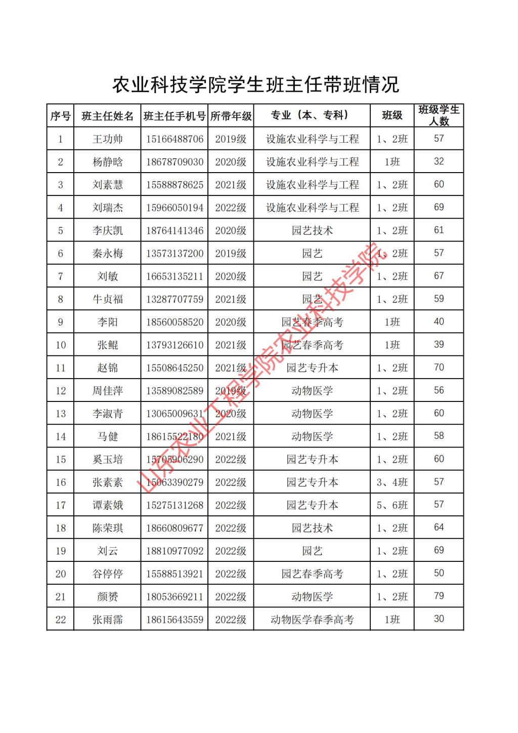 农业科技学院班主任名单(2022-2023 学年)
