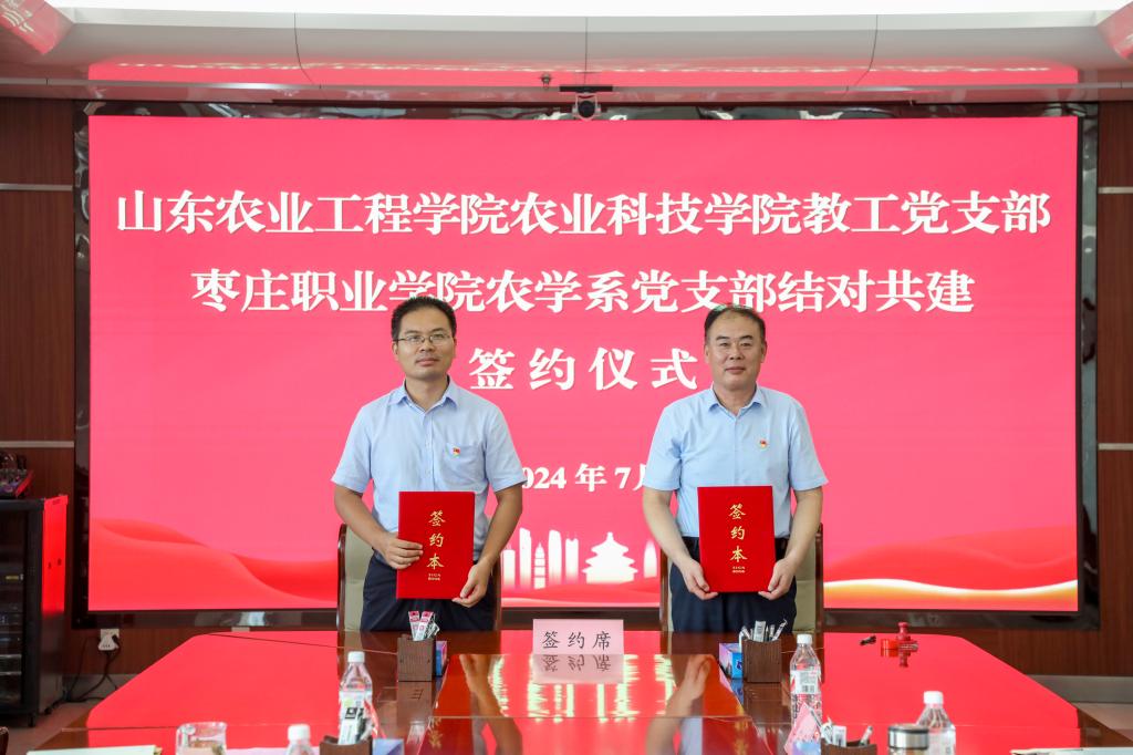 枣庄职业学院农学系党支部书记赵文杰与我院教工党支部组织委员张鲲代表双方签署结对共建协议,正式结成党建合作友好伙伴。
