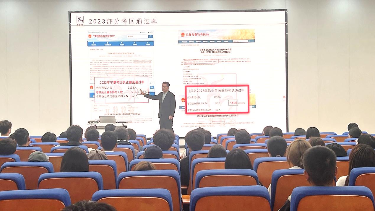 于老师还针对执业兽医资格考试的基础、临床、预防、综合四科考试涵盖的主要内容进行了说明,并深入分析了考试内容与校内课程学习之间的关系。他着重强调了各课程在考试中的占比,以助力同学们有针对性地开展执业兽医资格考试复习。于老师鼓励同学们结合专业学习进度,在校期间分批报考相应科目,待四科全部通过后,便可申请成绩认定,进而申领执业兽医资格证,如此一来,毕业时就能同时取得毕业证和执业兽医师资格证,大大提升就业竞争力。