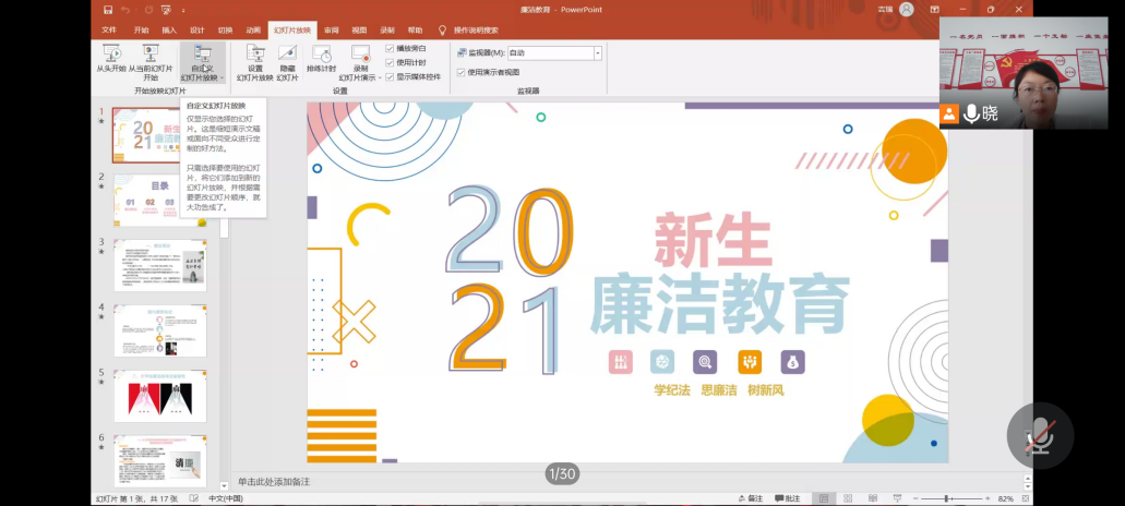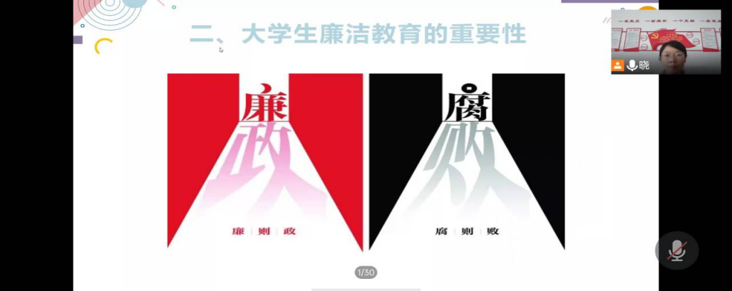 为贯彻落实习近平总书记关于教育重要论述,宣传廉洁文化,普及廉洁知识,提高农业科技学院2021级新生的廉洁自律意识和纪律规矩意识,10月27日下午,我院开展了一场以“学纪法 思廉洁 树新风”为主题的线上班会活动,班会由华晓晓老师主持。