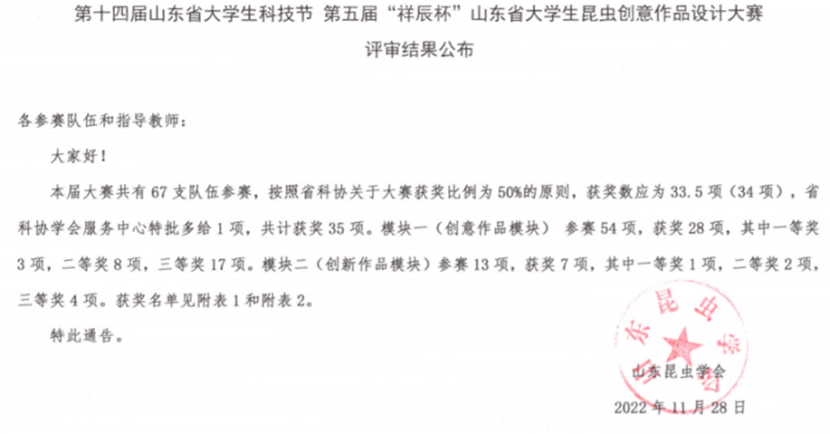 11月5日,第五届‘祥辰杯’山东省大学生昆虫创意作品设计大赛落下帷幕。我院1支队伍进入决赛,并最终获得创意竞赛模块二等奖。